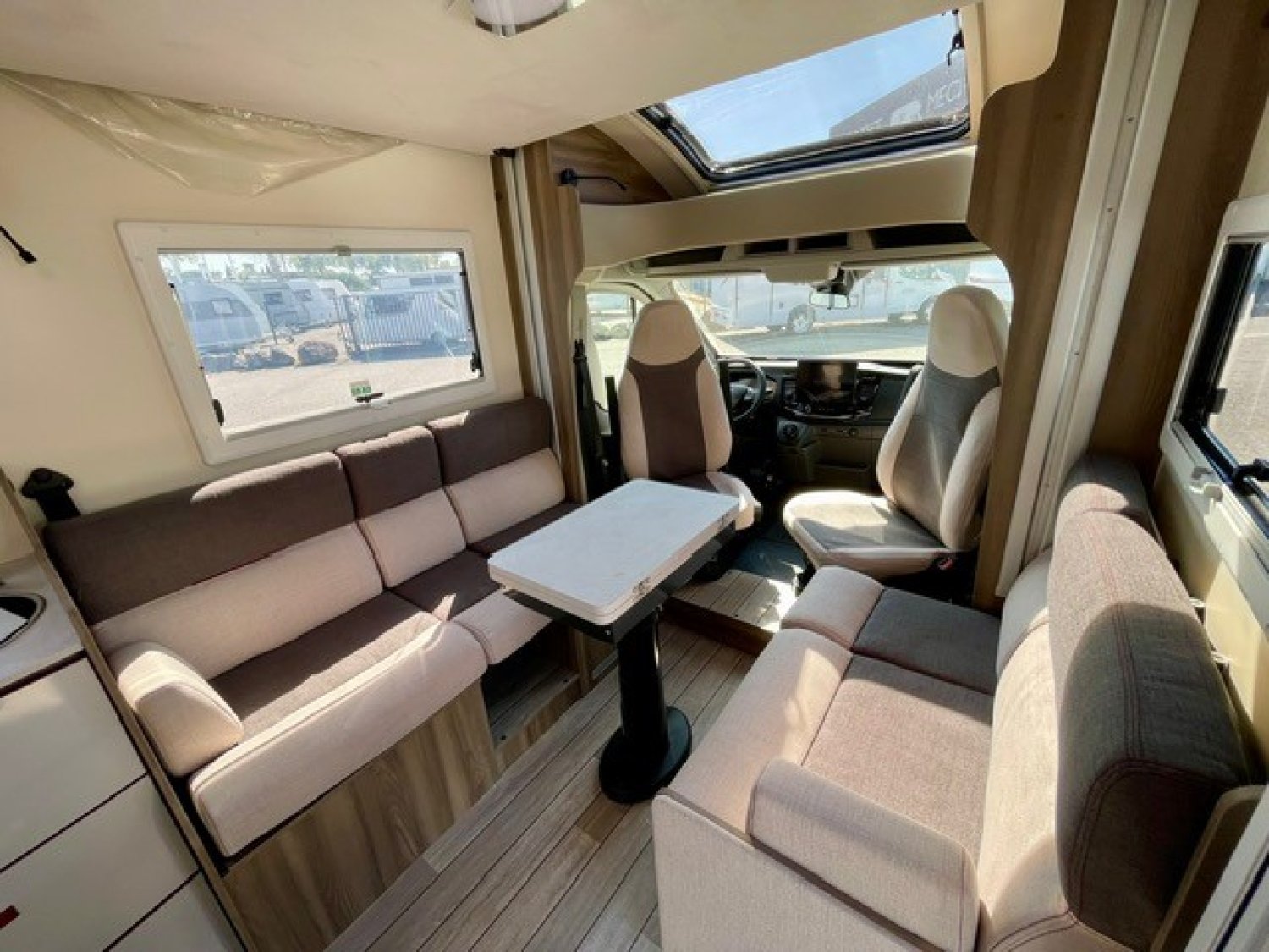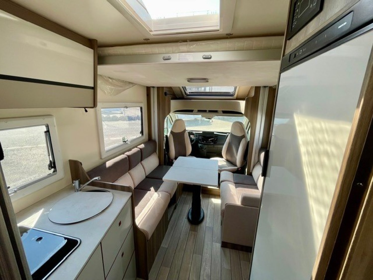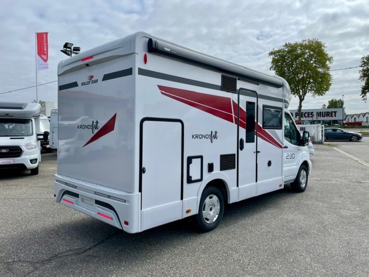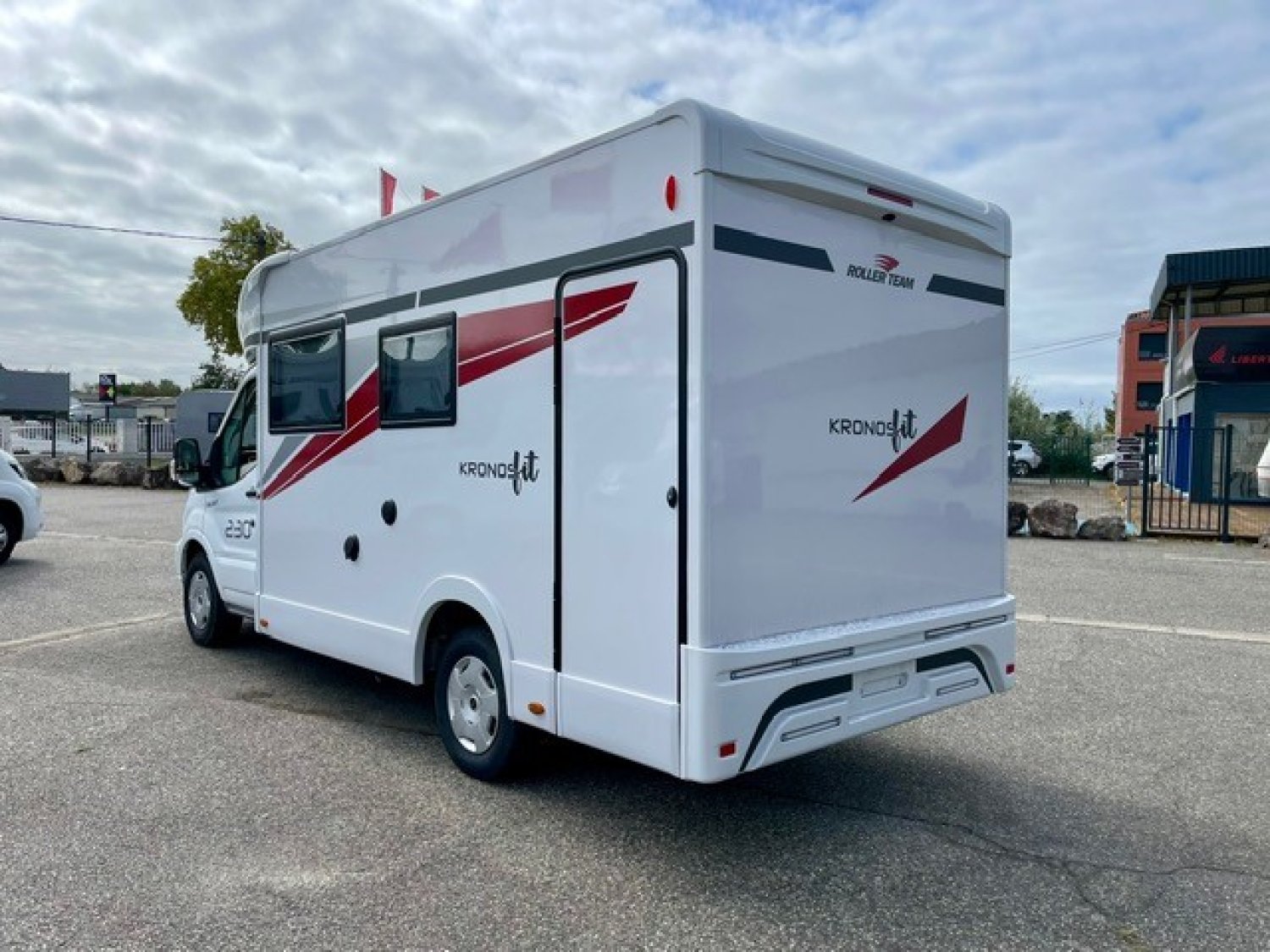 Rollerteam Kronos Fit 230TL, profilé compact de seulement 2,15m de large et 6,39m de long. Petit à l'extérieur et grand à l'intérieur grâce à son lit pavillon électrique 2 places et son maxi salon transformable en couchage. Spacieuse salle de bain arrière avec douche séparée.