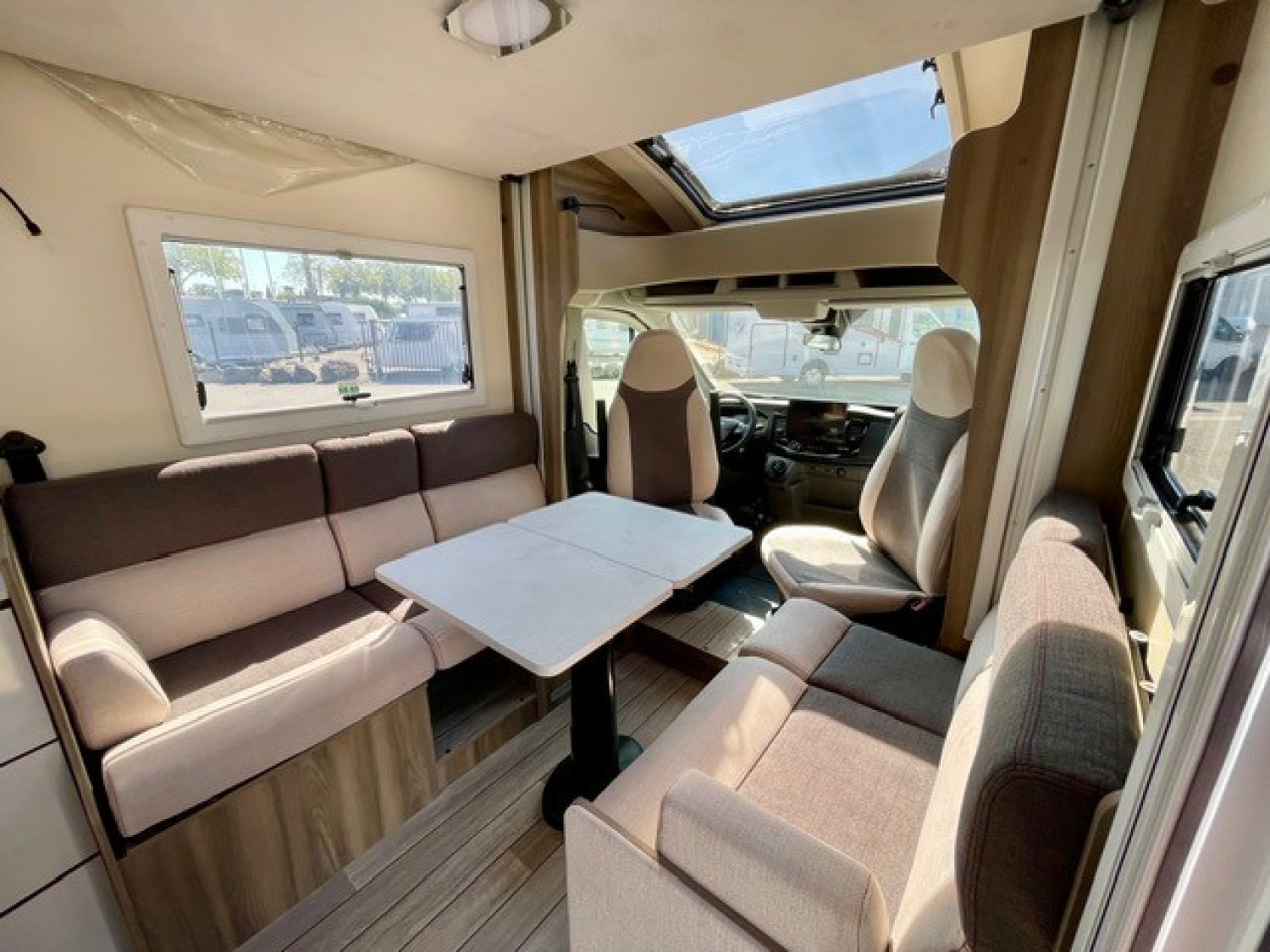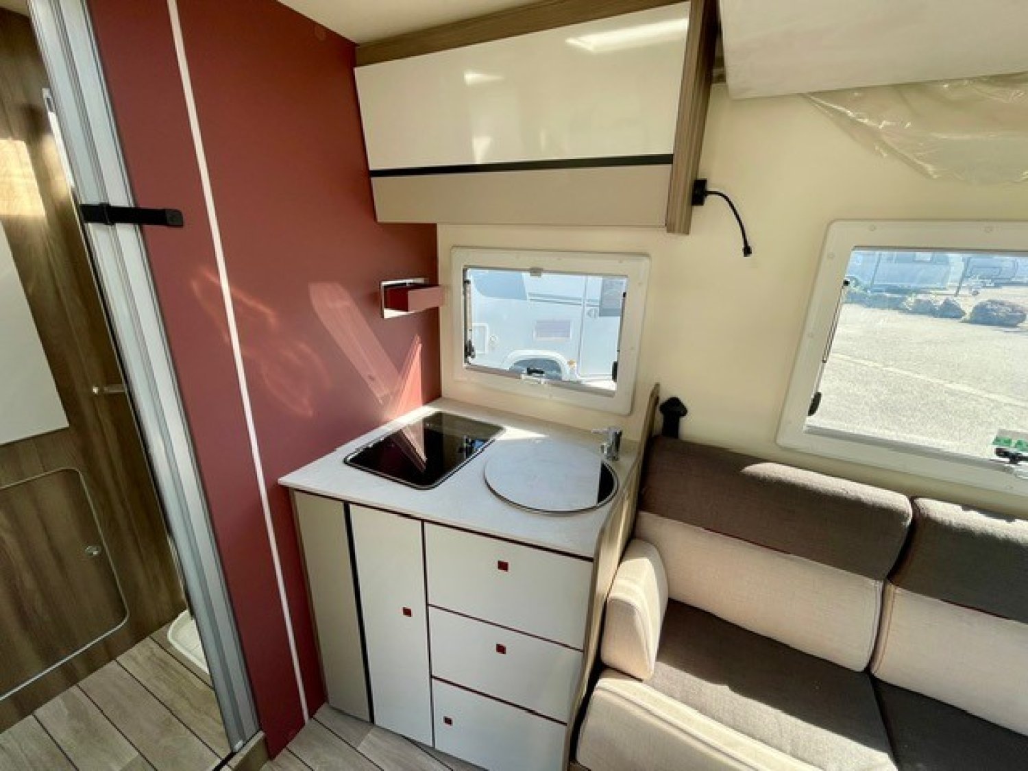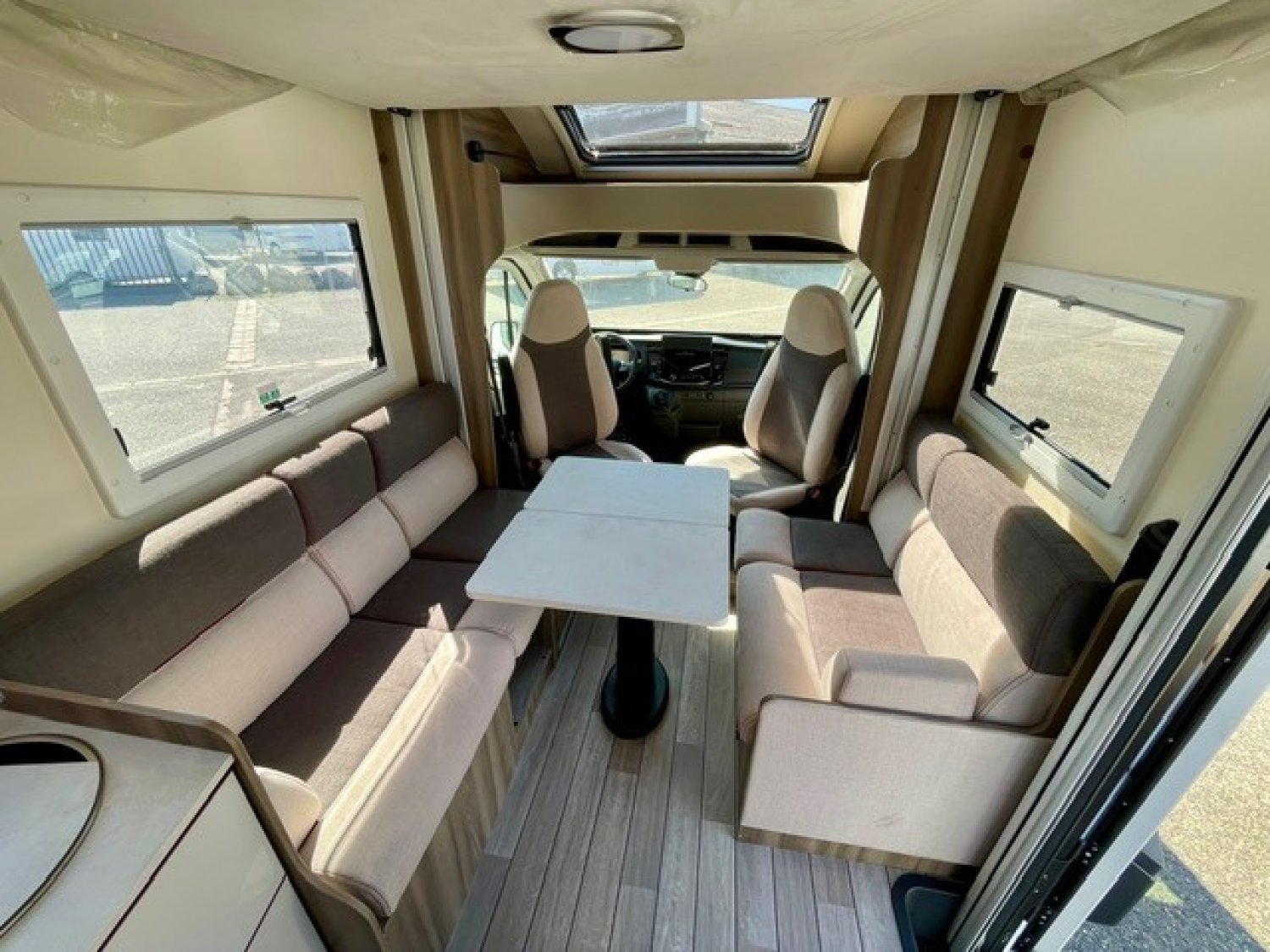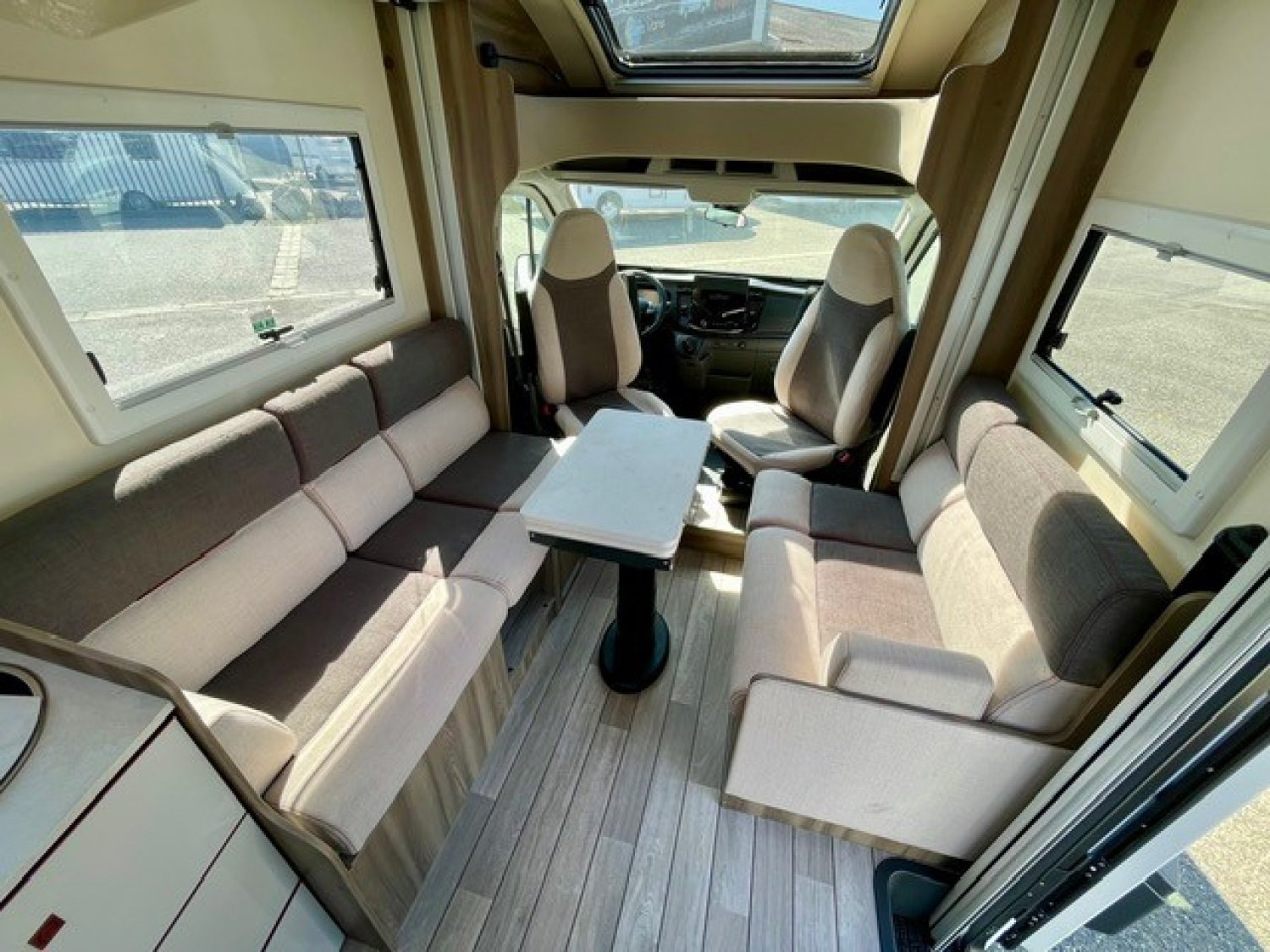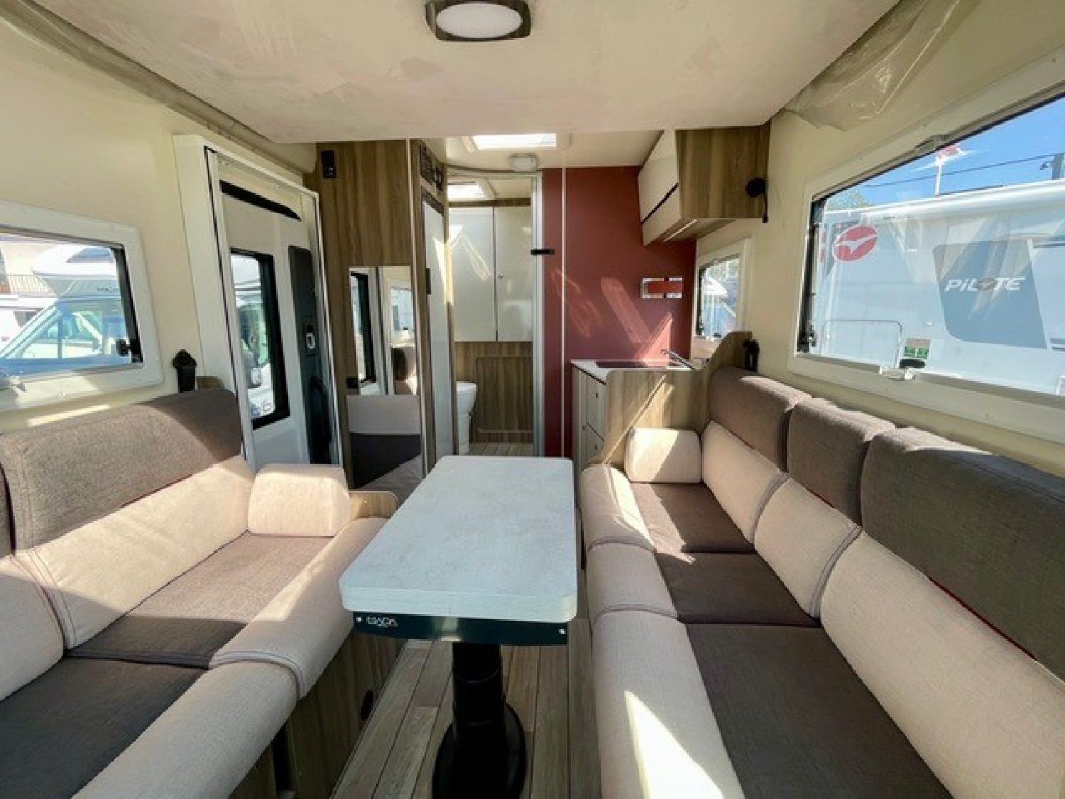 Rollerteam Kronos Fit 230TL, profilé compact de seulement 2,15m de large et 6,39m de long. Petit à l'extérieur et grand à l'intérieur grâce à son lit pavillon électrique 2 places et son maxi salon transformable en couchage. Spacieuse salle de bain arrière avec douche séparée.
