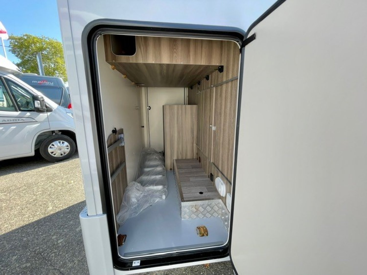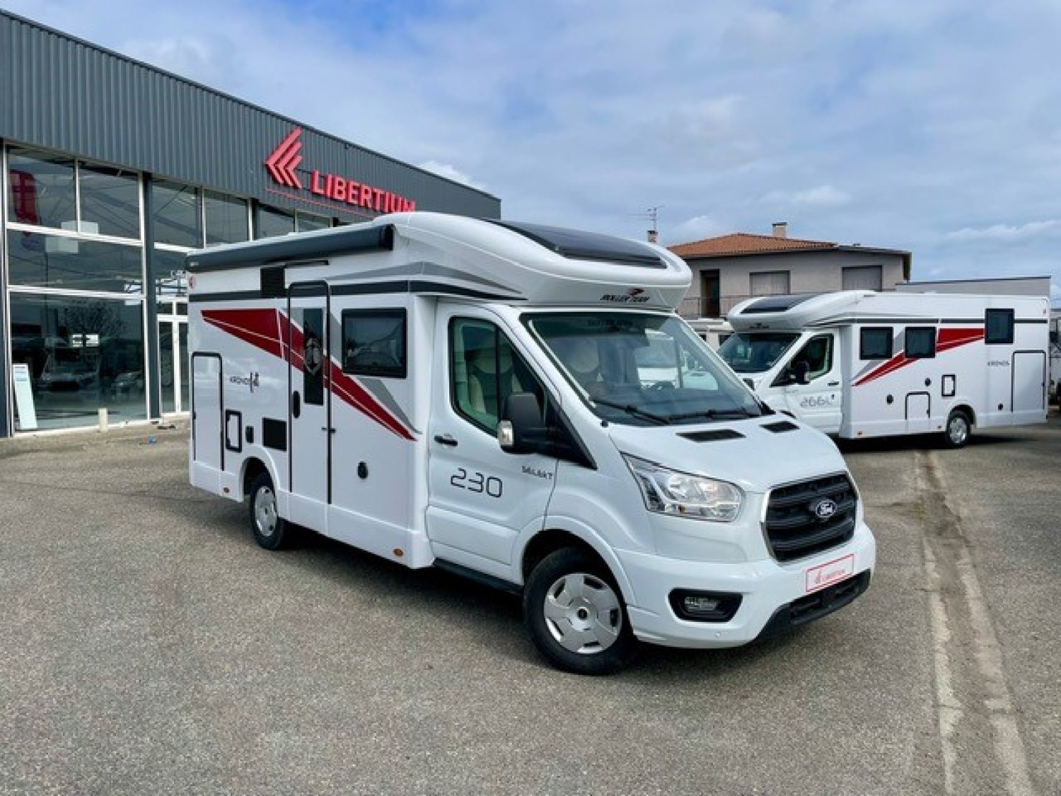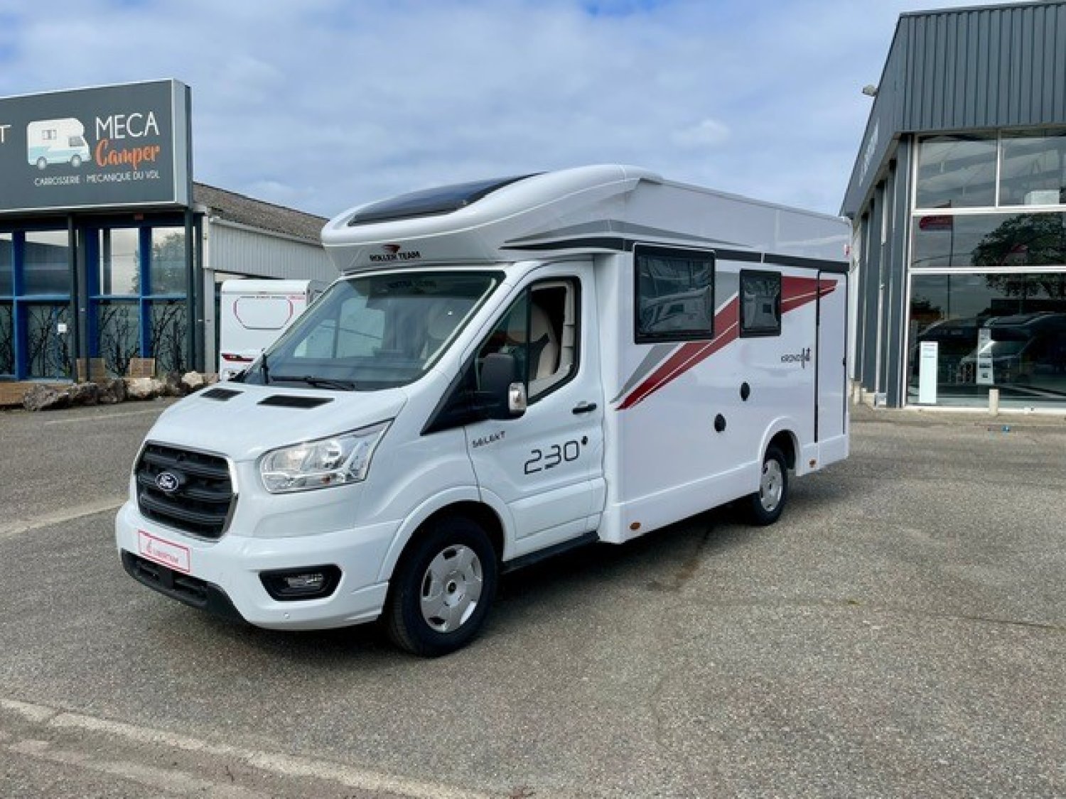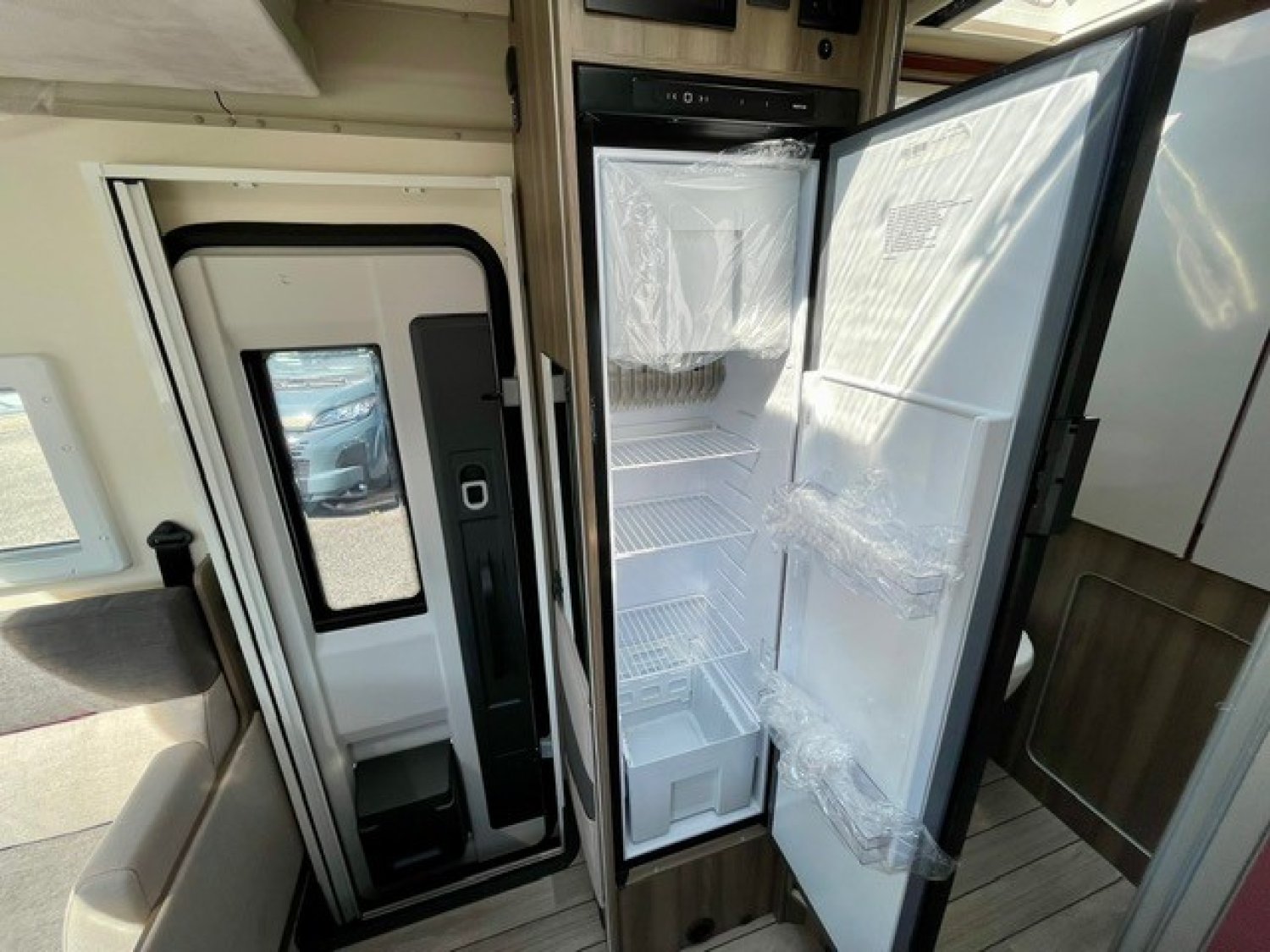 Rollerteam Kronos Fit 230TL, profilé compact de seulement 2,15m de large et 6,39m de long. Petit à l'extérieur et grand à l'intérieur grâce à son lit pavillon électrique 2 places et son maxi salon transformable en couchage. Spacieuse salle de bain arrière avec douche séparée.