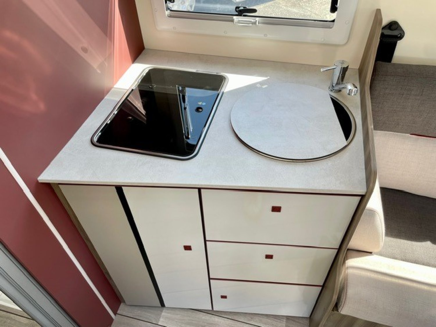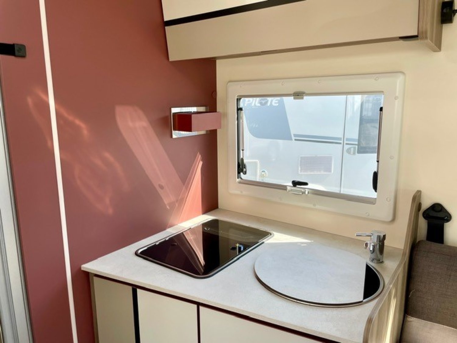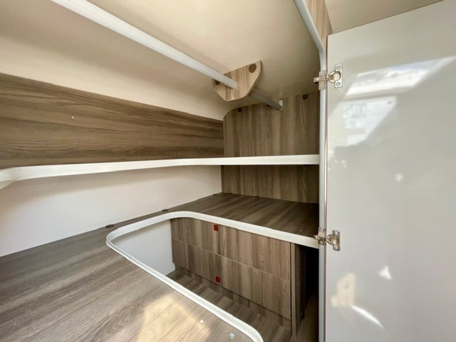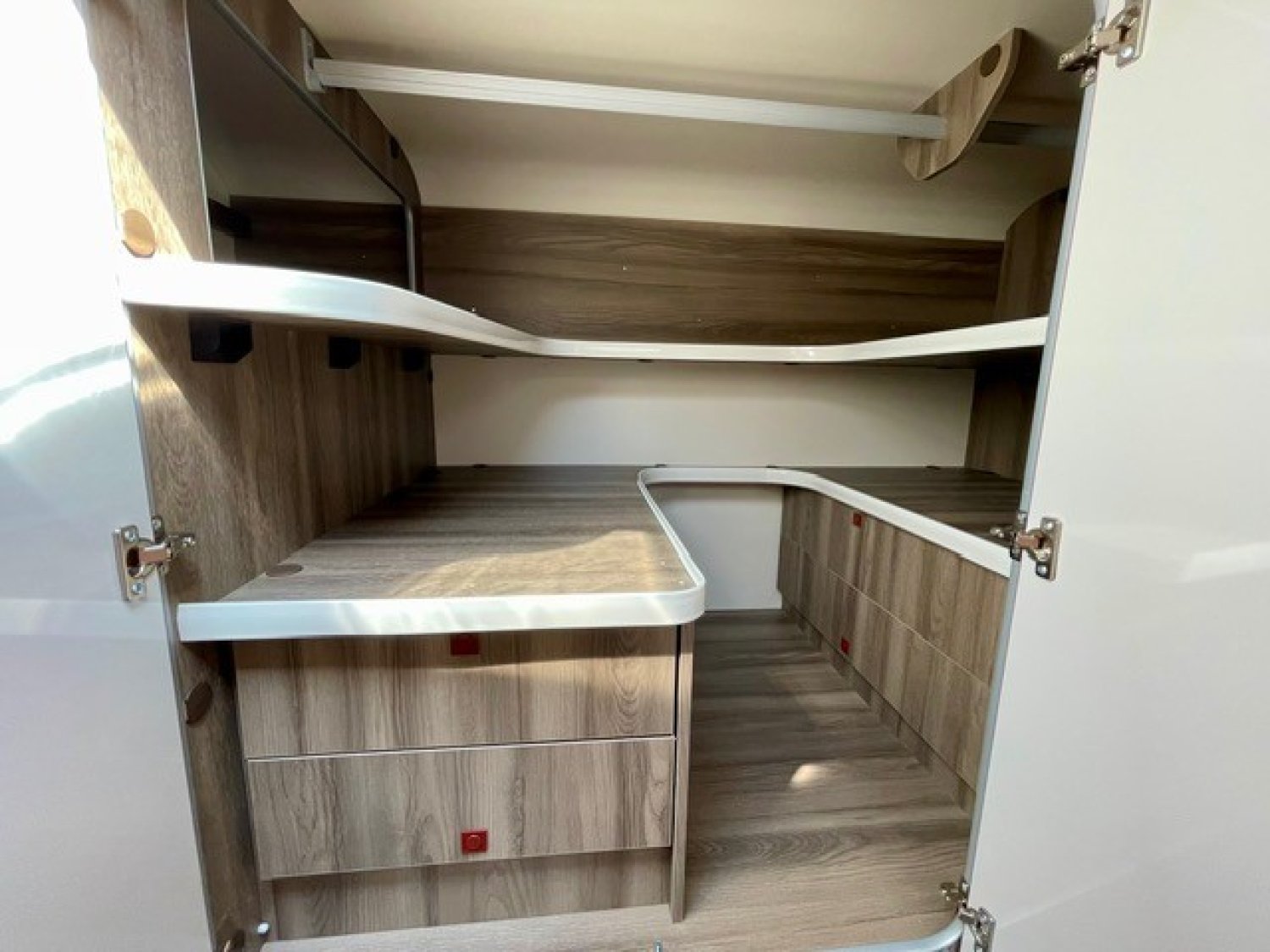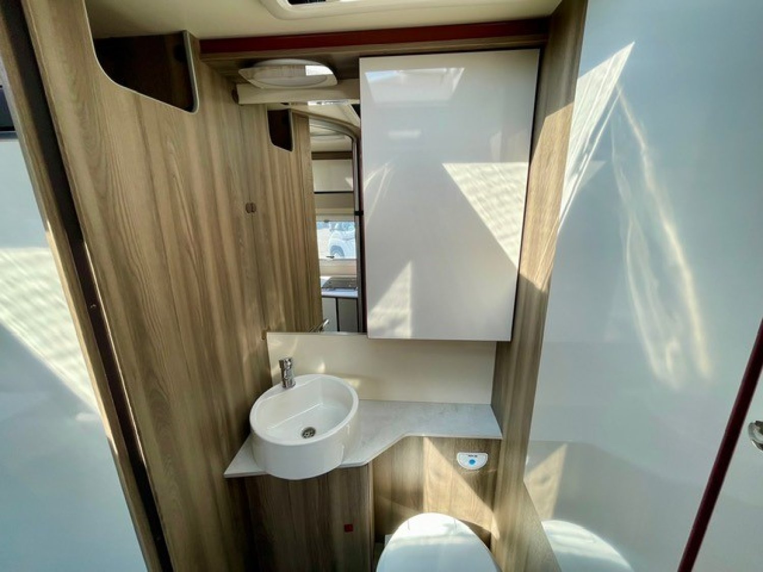 Rollerteam Kronos Fit 230TL, profilé compact de seulement 2,15m de large et 6,39m de long. Petit à l'extérieur et grand à l'intérieur grâce à son lit pavillon électrique 2 places et son maxi salon transformable en couchage. Spacieuse salle de bain arrière avec douche séparée.