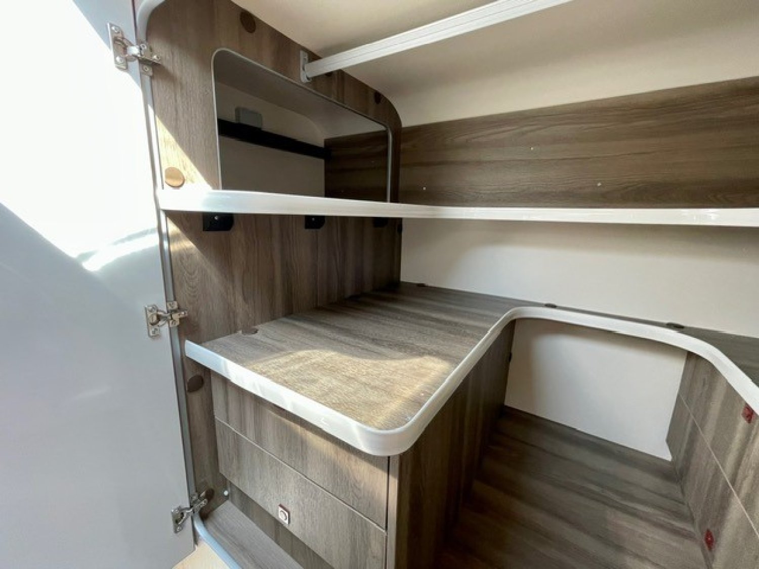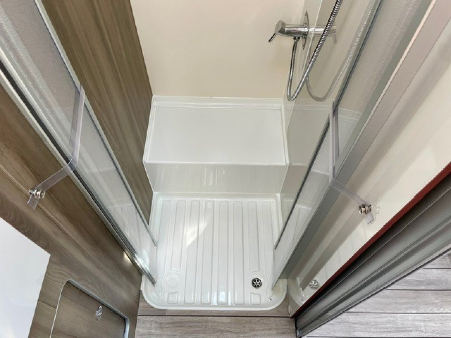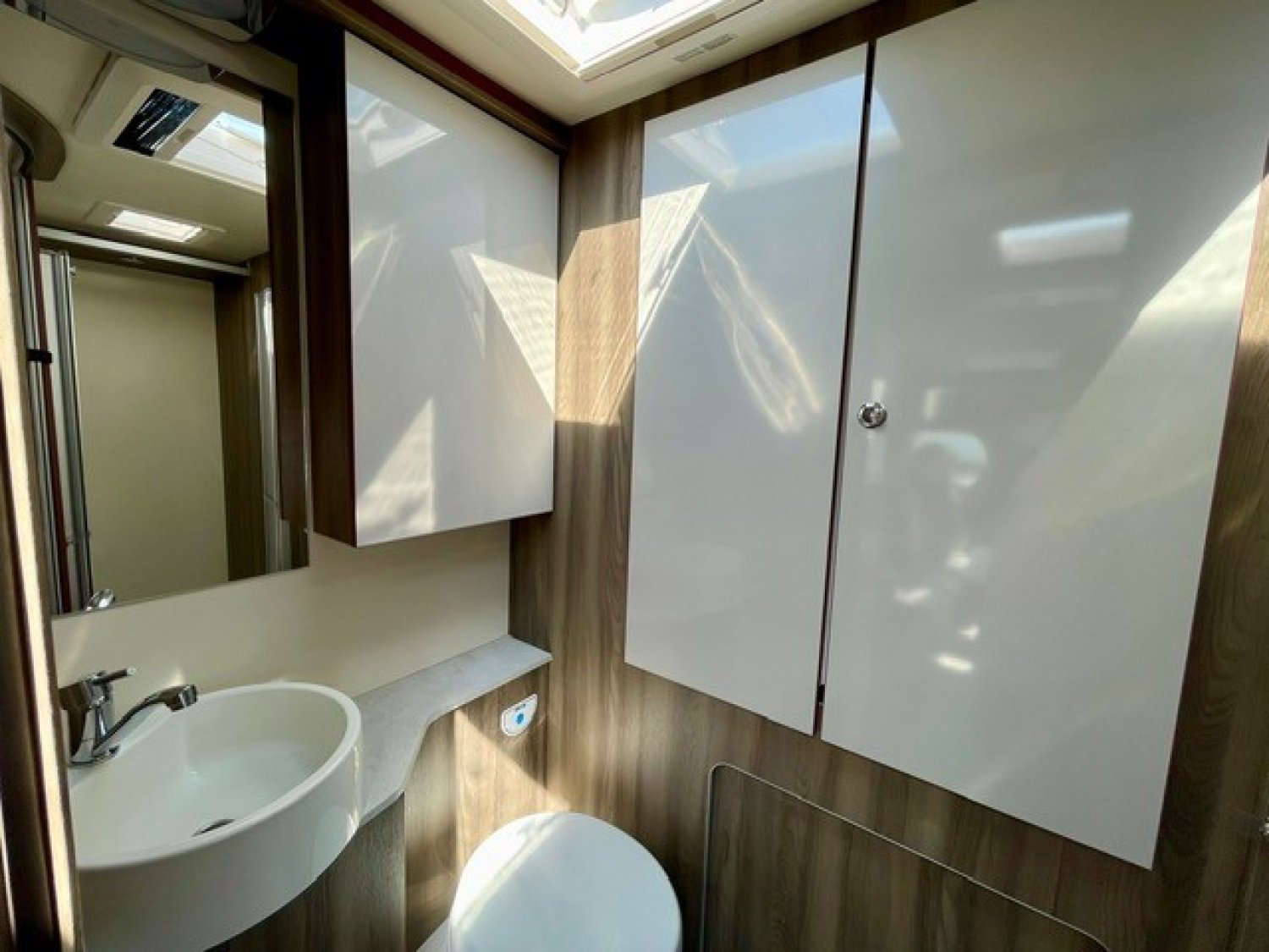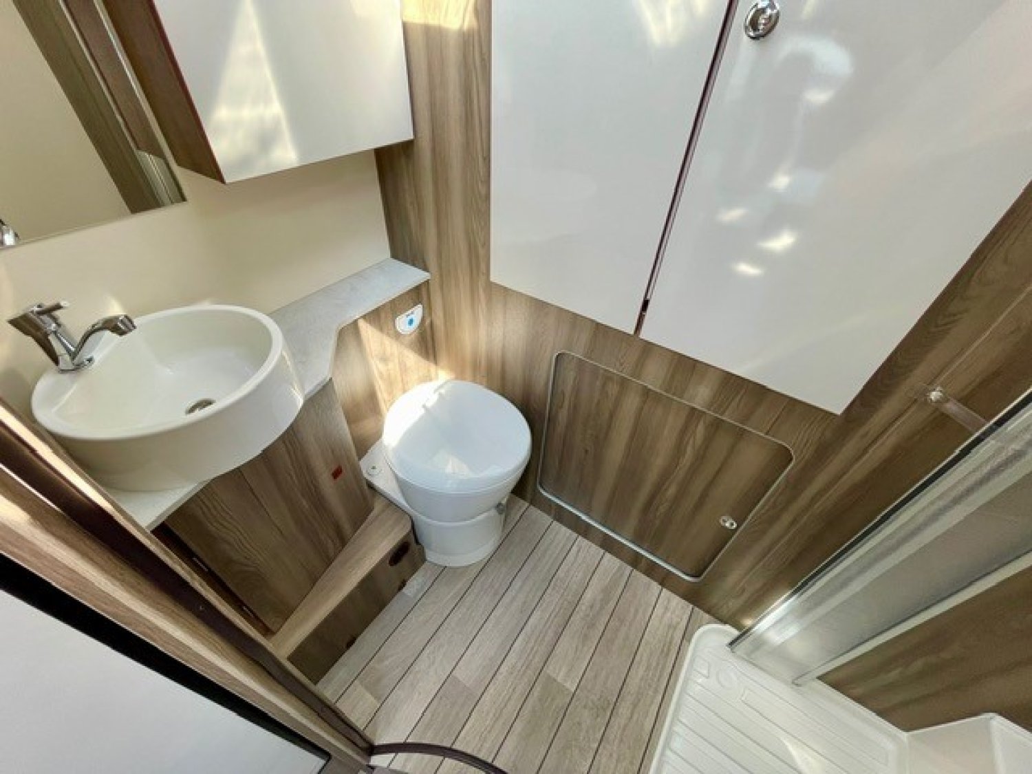Rollerteam Kronos Fit 230TL, profilé compact de seulement 2,15m de large et 6,39m de long. Petit à l'extérieur et grand à l'intérieur grâce à son lit pavillon électrique 2 places et son maxi salon transformable en couchage. Spacieuse salle de bain arrière avec douche séparée.