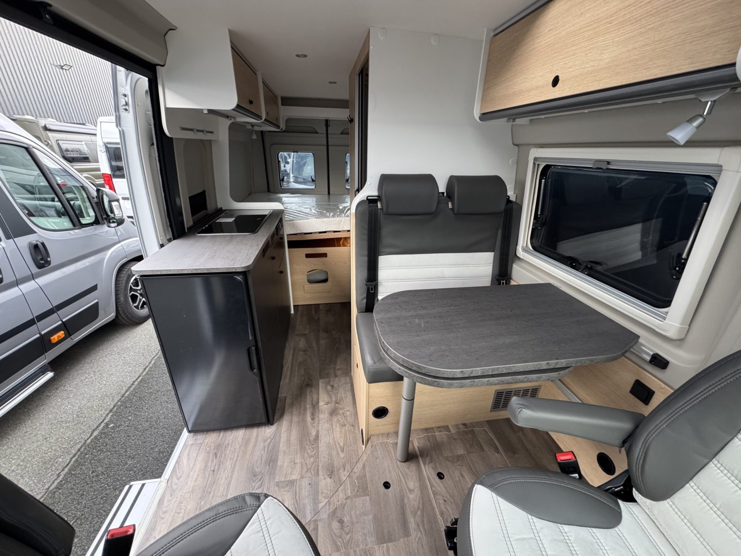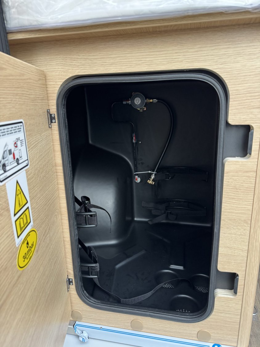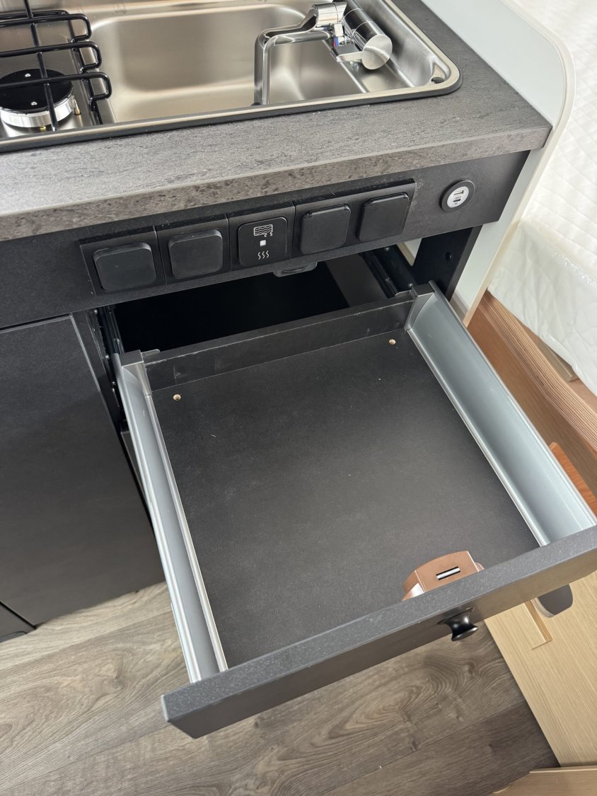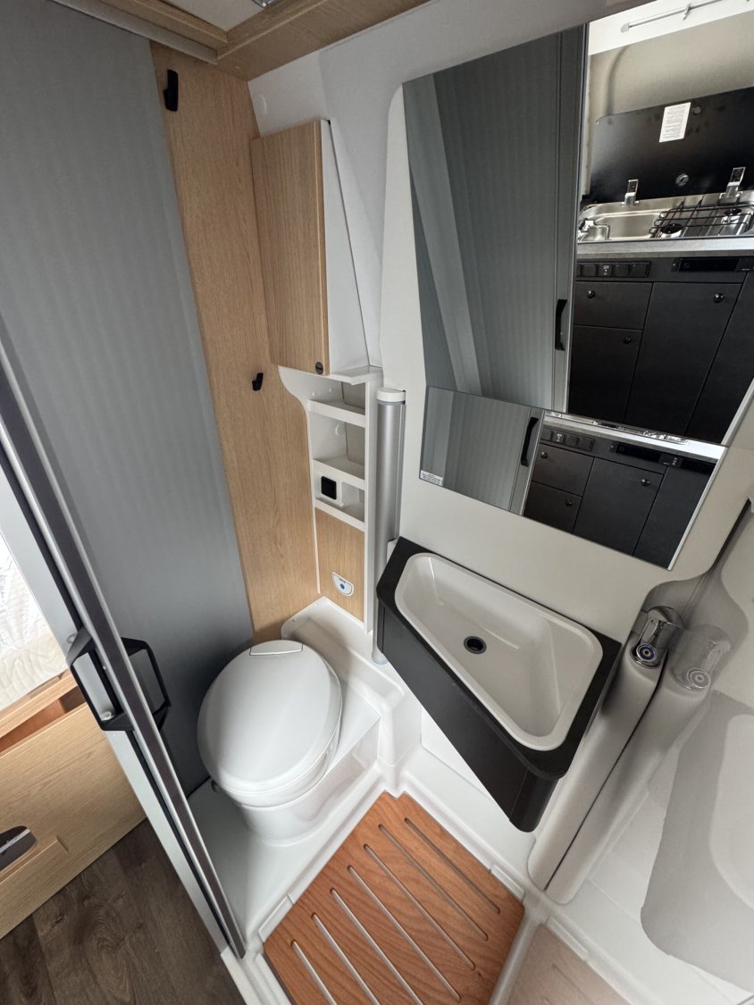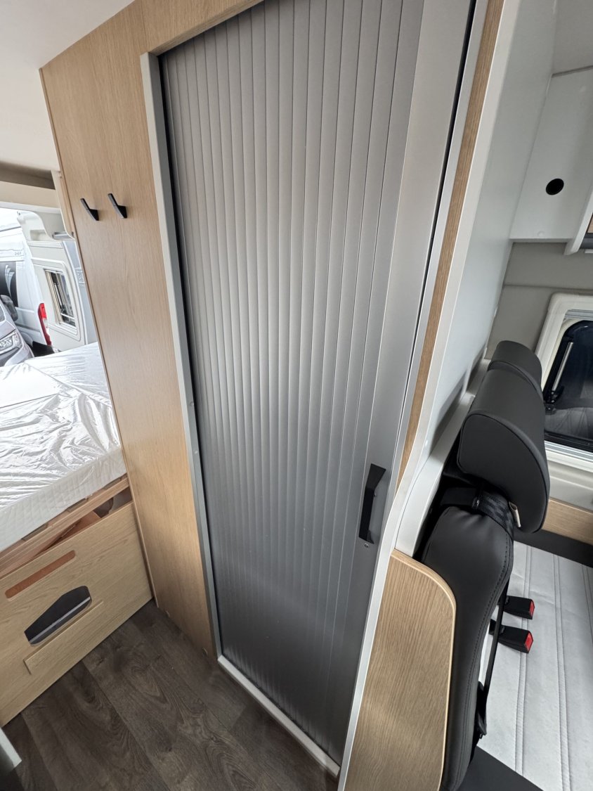 Volant et pommeau du levier de vitesses en cuir, Tableau de bord avec finition aluminium (Techno-Trim), Store Noir, SKYVIEW, Baies à cadre, Douche VARIO, Lanterneau panoramique 70 x 50 cm | Pack Douche | Baie dans le cabinet de toilette | Tringle à vêtements dans la salle d’eau | Large marchepied |Rallonge de table dans la dînette…