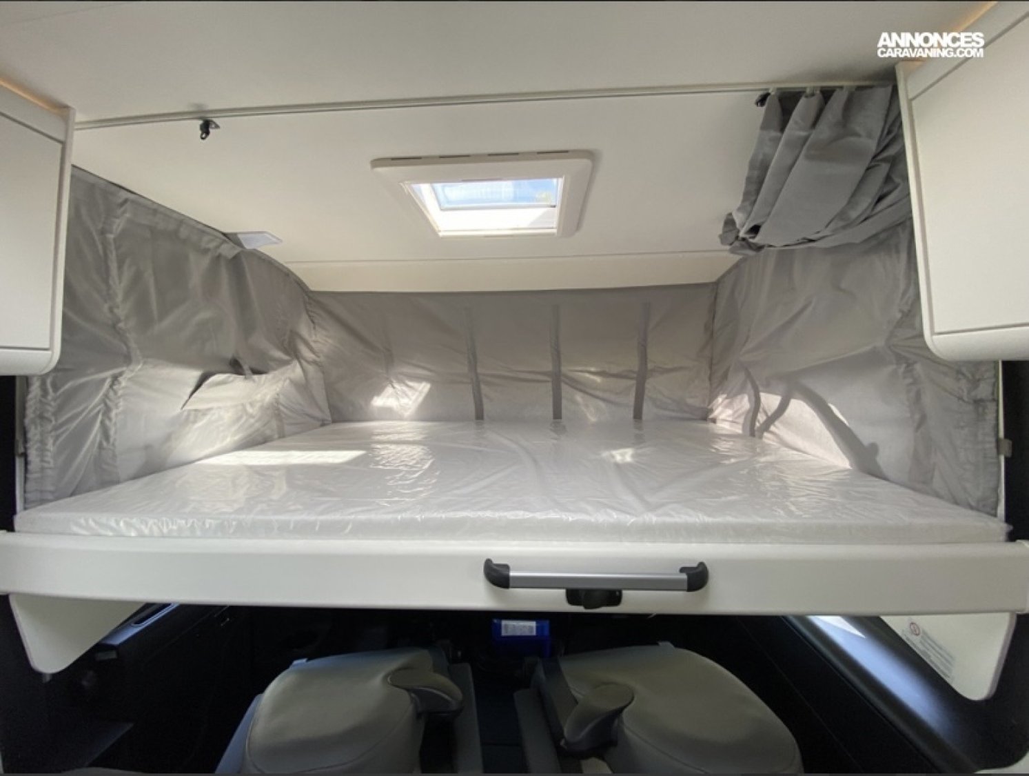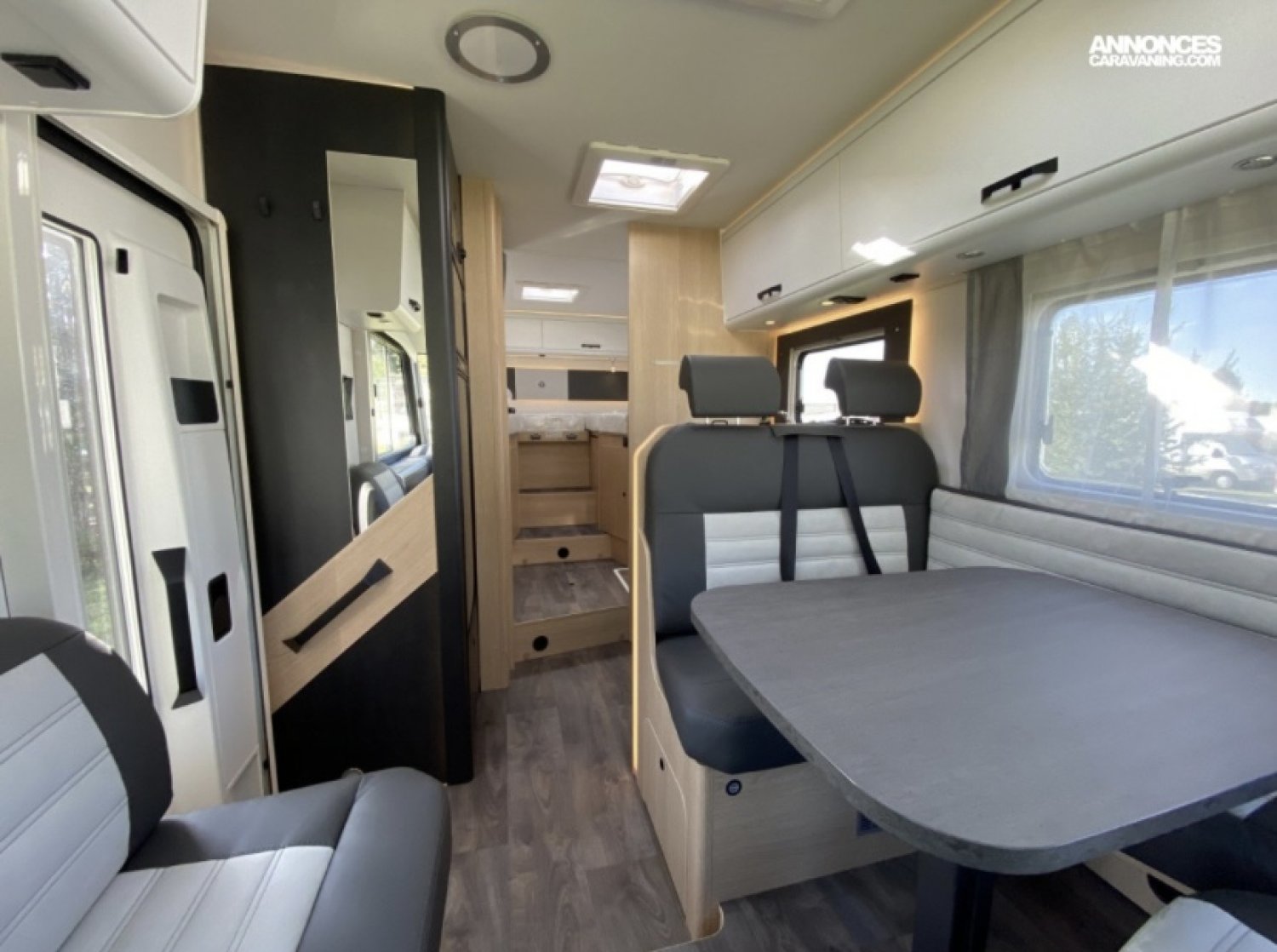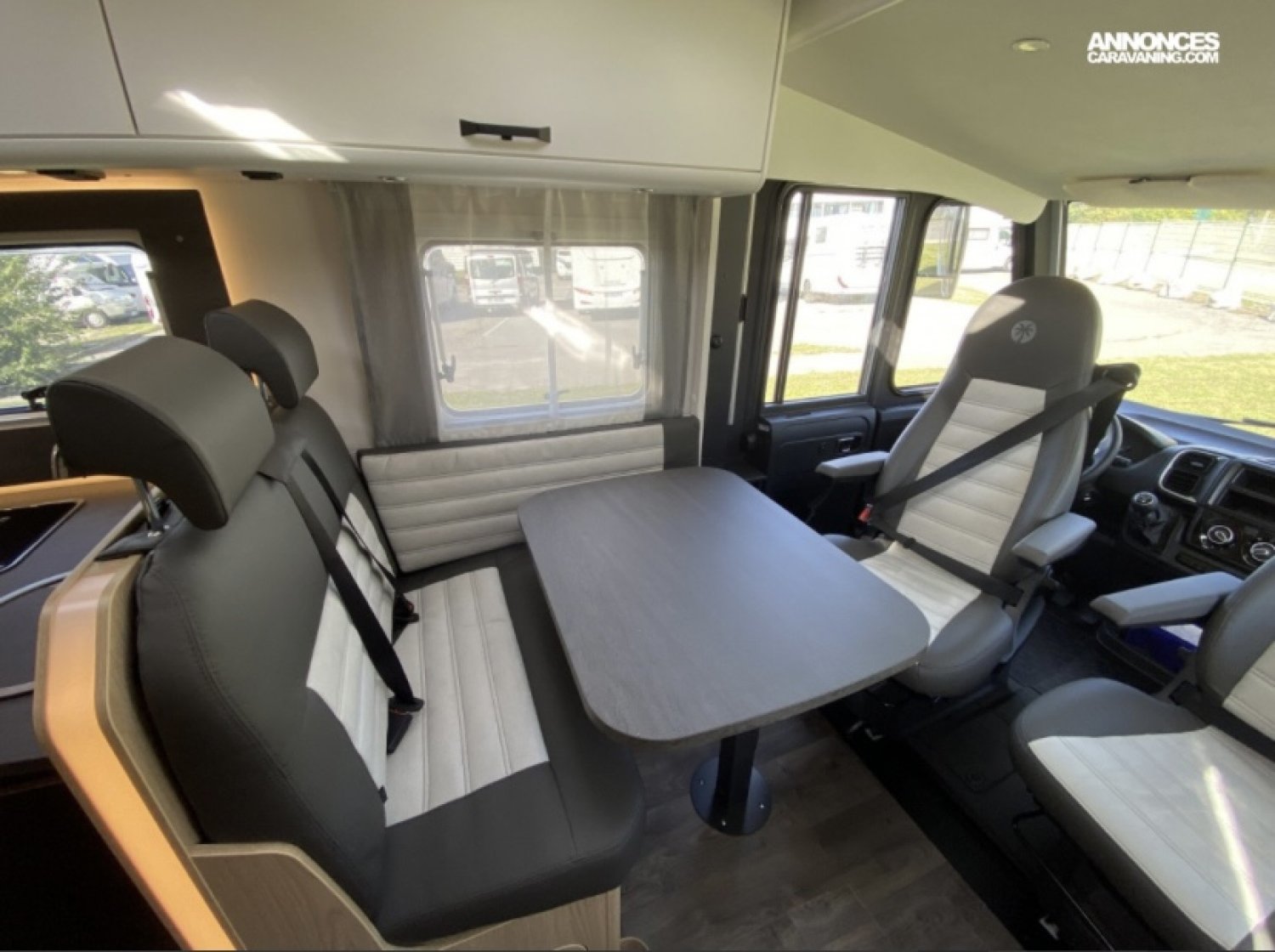 . 5 places en carré avec les deux sièges pivotant en cabine ,banquette en face avec 2 ceintures de sécurité ( fixation isofix ) et une place assise de chaque côté
