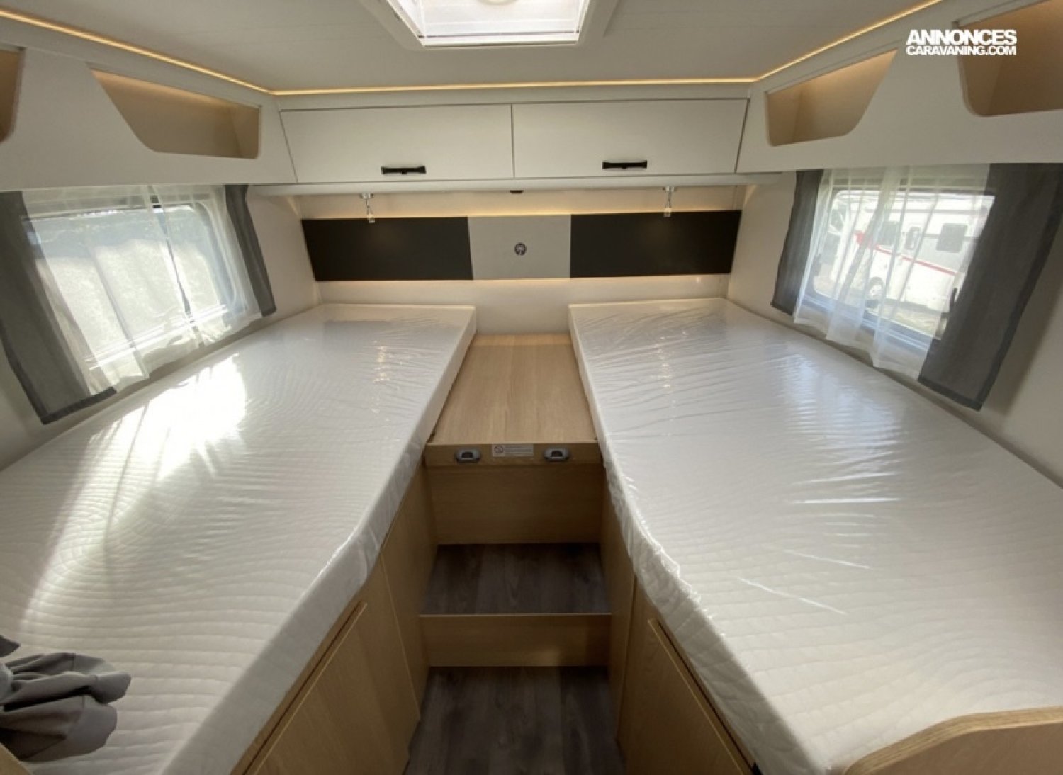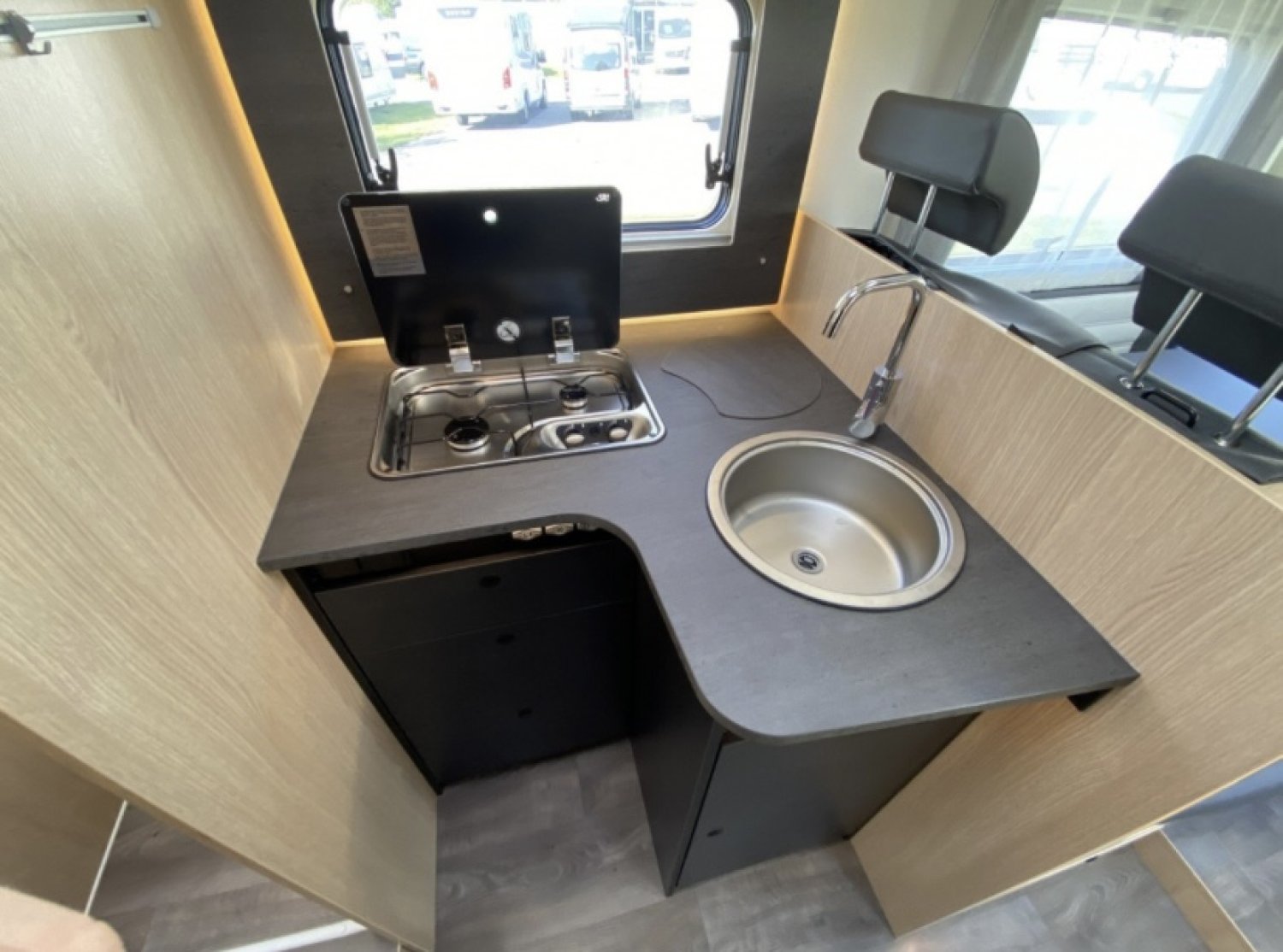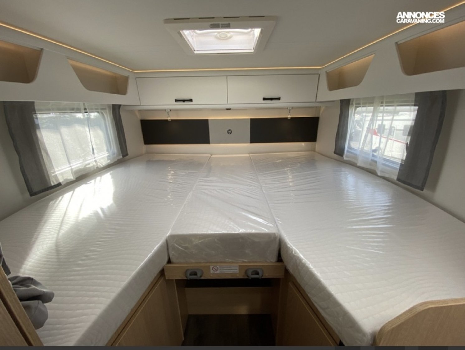 . 5 places en carré avec les deux sièges pivotant en cabine ,banquette en face avec 2 ceintures de sécurité ( fixation isofix ) et une place assise de chaque côté