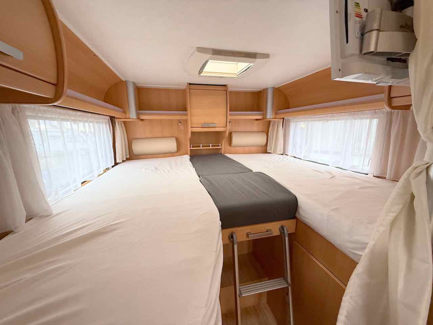 Les lits jumeaux, 199 x 75 cm et 188 x 75 cm, peuvent être réunis en un seul grand lit arrière.