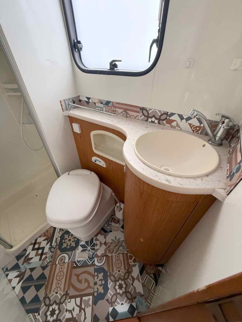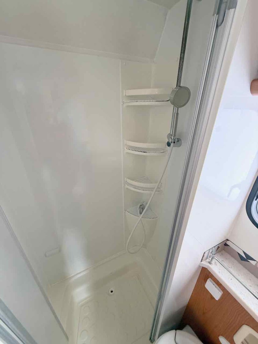 La salle d’eau est à l’arrière : cabinet de toilette, avec w.c. à cassette et douche séparée.