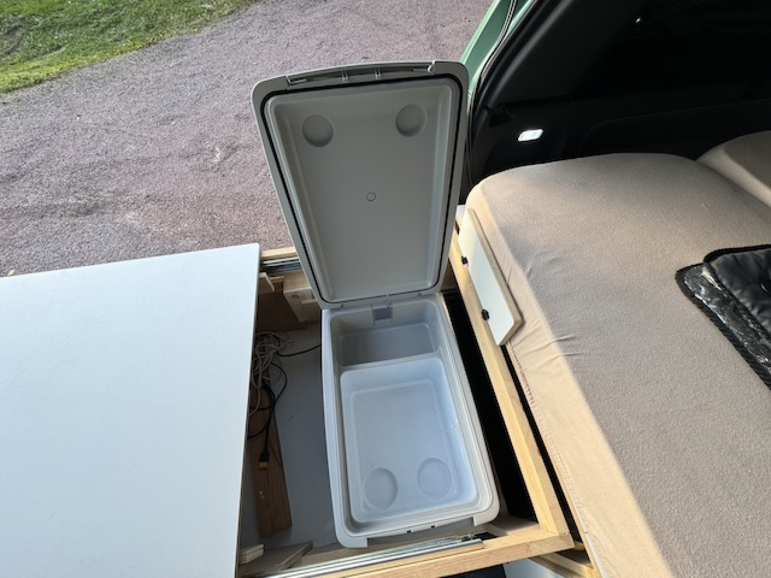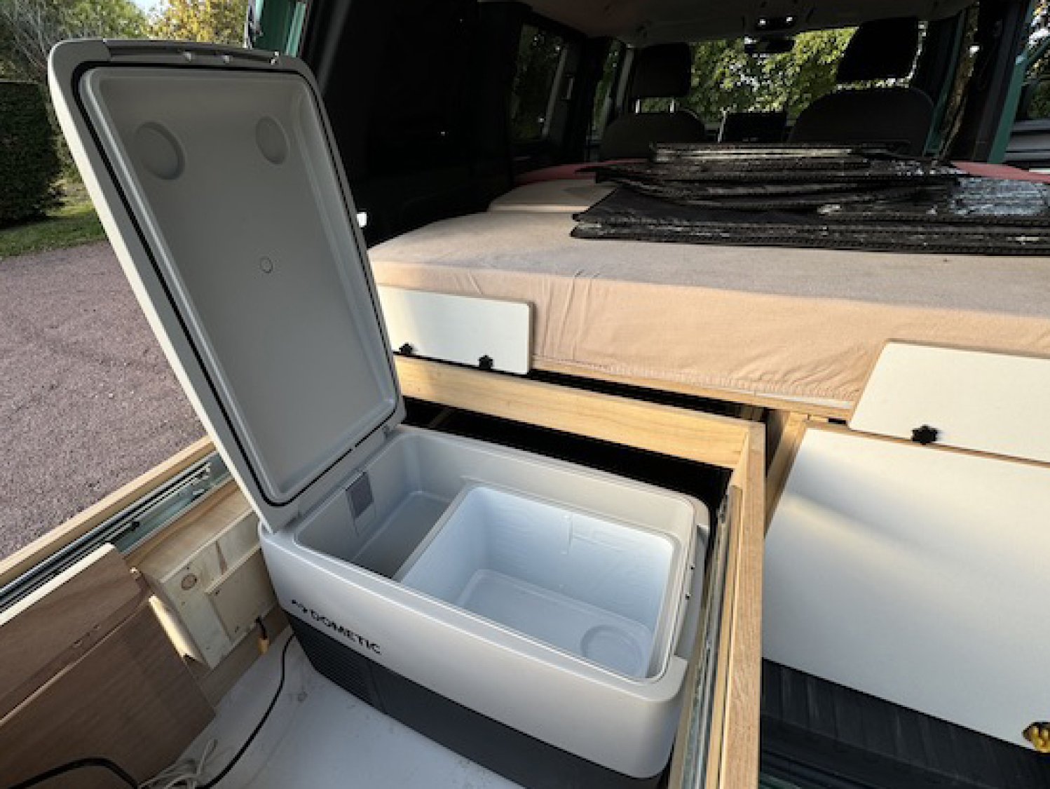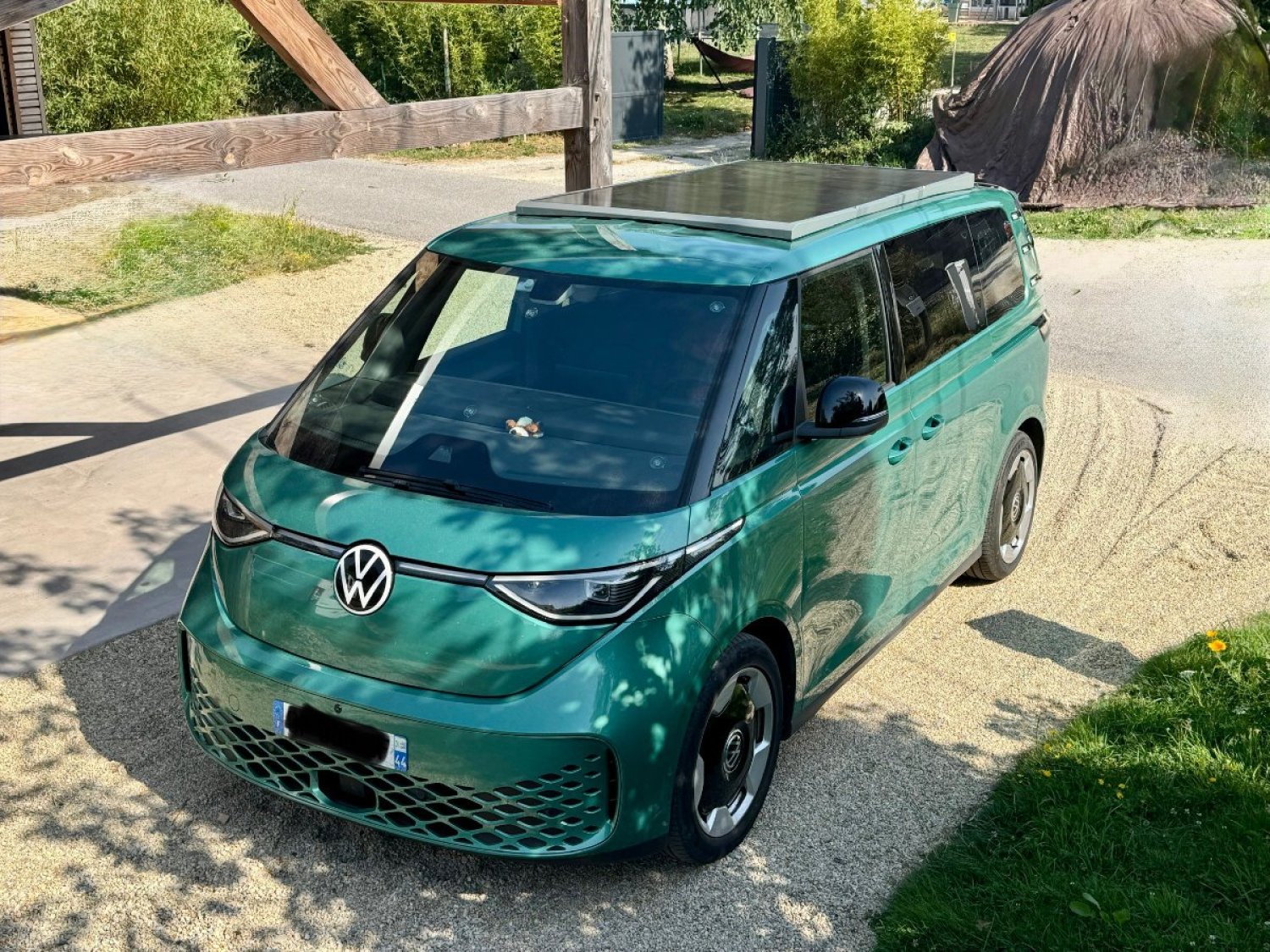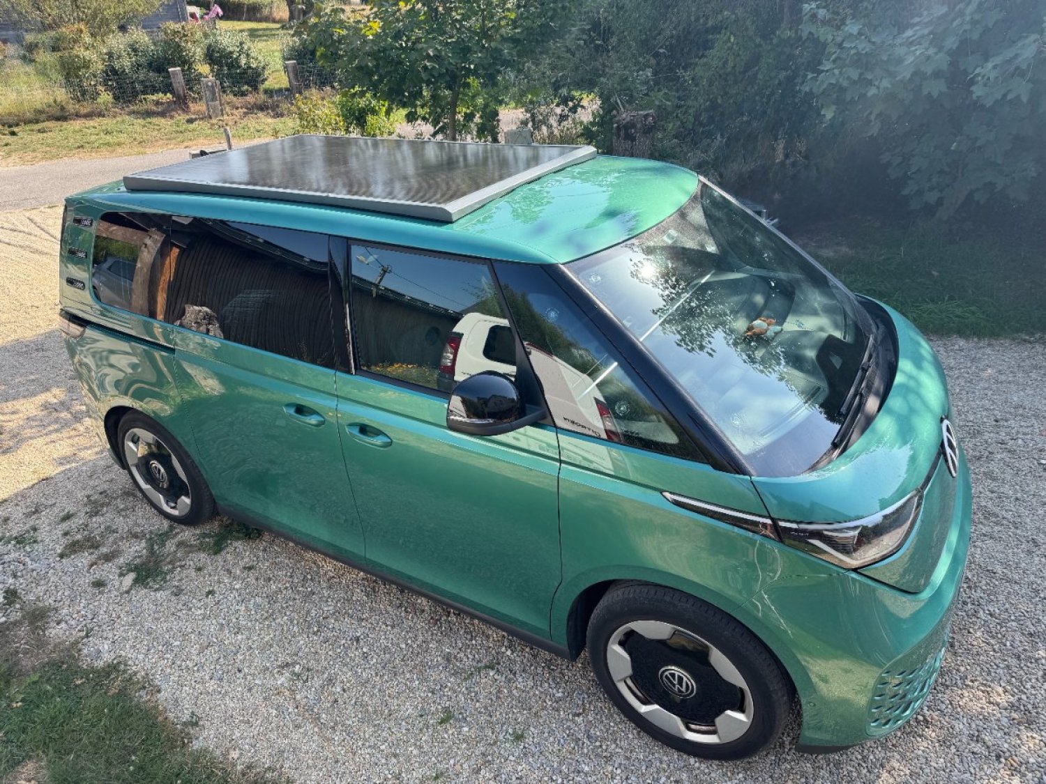ID. Buzz Pro avec presque toutes les options de confort et navigation Volkswagen d'origine. Aménagement très professionnel en contreplaqué bouleau mélaminé haute qualité, structure en frêne massif. Conception et réalisation professionnelle très astucieuse et minutieuse. Grande modularité, possibilité de passer de la version "voiture" 5 places assises en quelques secondes à la version 3 places avec salon duo et table. Enfin la configuration "couchage" d'un simple coulissement de module fait apparaitre un grand lit central. Le van est équipé de nombreux rangements dont deux grands tiroirs de rangement latéraux pour les vêtements. Depuis le hayon se déploie deux grands tiroirs arrières coulissants sur la totalité da la profondeur du coffre, contenant tout l'équipement pour la cuisine et d'autres rangements ainsi que la centrale énergie constitué d'une batterie Bluetti AC200MAX de 2048 kWh alimentée par panneau solaire de 600W et la prise 220v native de l'ID Buzz. La batterie permet le fonctionnement de tous les appareils électriques en 220v jusqu'à 2100 Watt (bouilloire, plaque à induction, glacière Dometic) et tout accessoire 12v ou USB. Sur le tiroir principal se trouve un plan de travail coulissant, l'autre tiroir contient le réservoir d'eau avec robinet et des caisses de rangements multiples amovibles. En mode 3 places il est possible mais pas obligatoire d'enlever la banquette arrière gauche deux places et d'y placer le coffre conçu sur mesure, découvrant un énorme espace de rangement pour les sièges de camping, table de camping, tante de hayon et autre affaires ou accessoires.