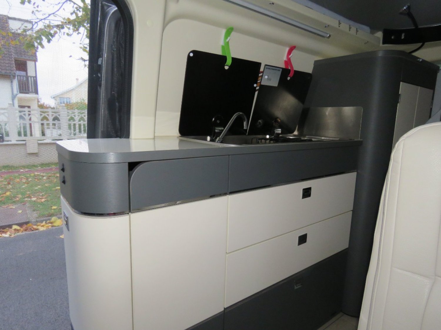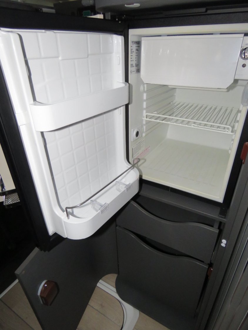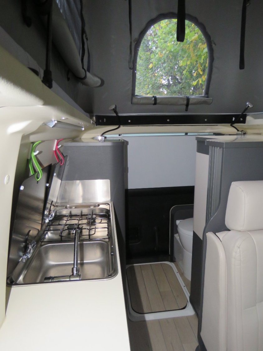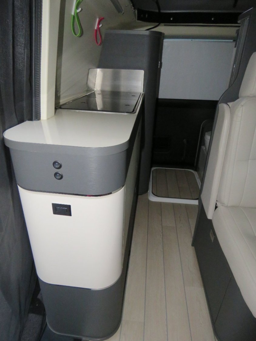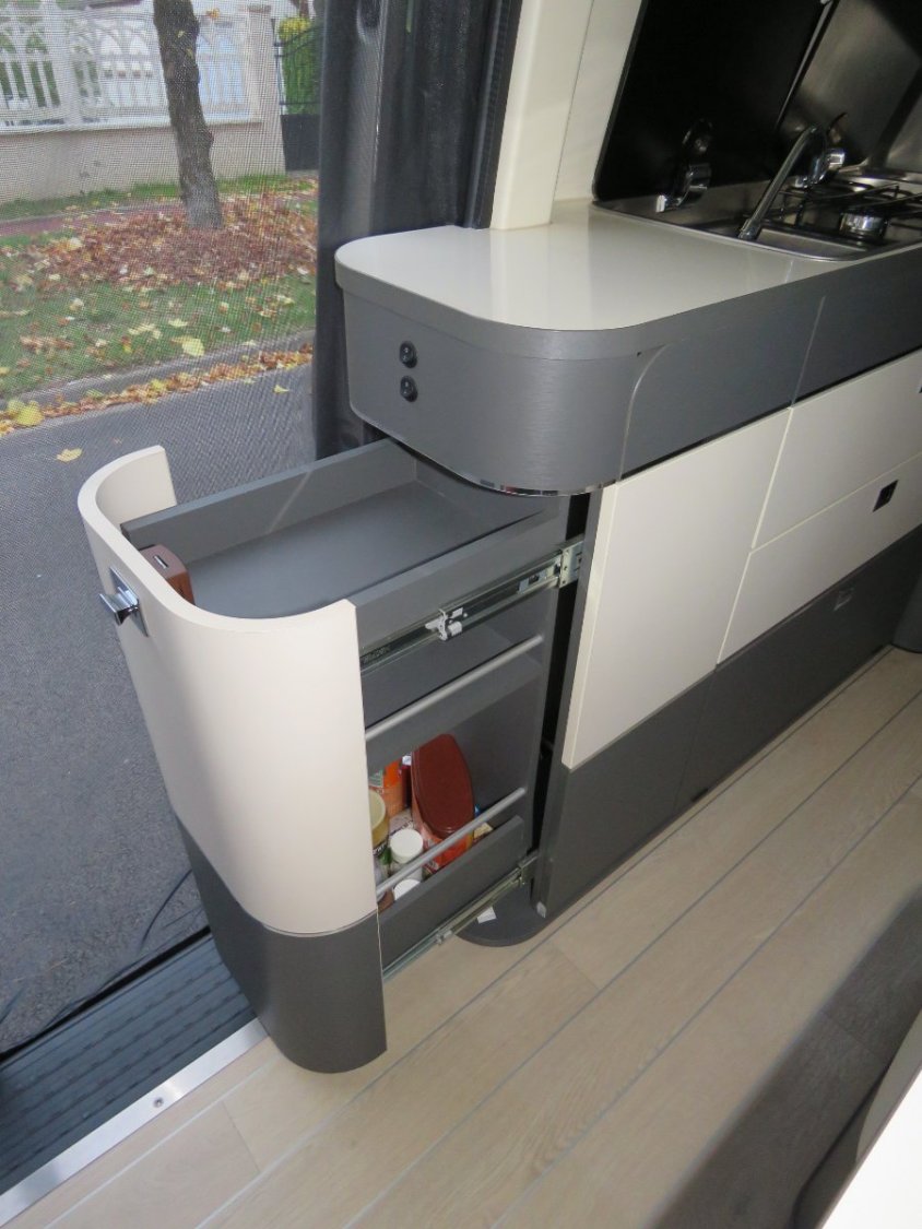 Le van dispose aussi d‘une cuisine séparée : en plus d‘un réchaud avec deux feux, d‘un évier et d‘un plan de travail en revêtement stratifié, il y a deux grands tiroirs, un placard en partie inférieure (bouteilles), et un grand compartiment (tiroir) à l’extrémité.