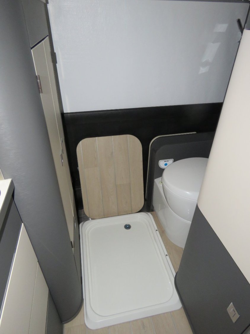 A l’arrière du van : douchette extérieure ou intérieure à eau chaude (bac + rideau de douche en tissu), WC chimique, placard à vêtements avec petite penderie, placard salle de bain, un petit compartiment pour rangement et emplacement bouteille de gaz, accès au lit supérieur (accès par petite échelle, le lit double principal est situé sous le toit relevable, il offre une surface de 1,90 x 1,20 m.)