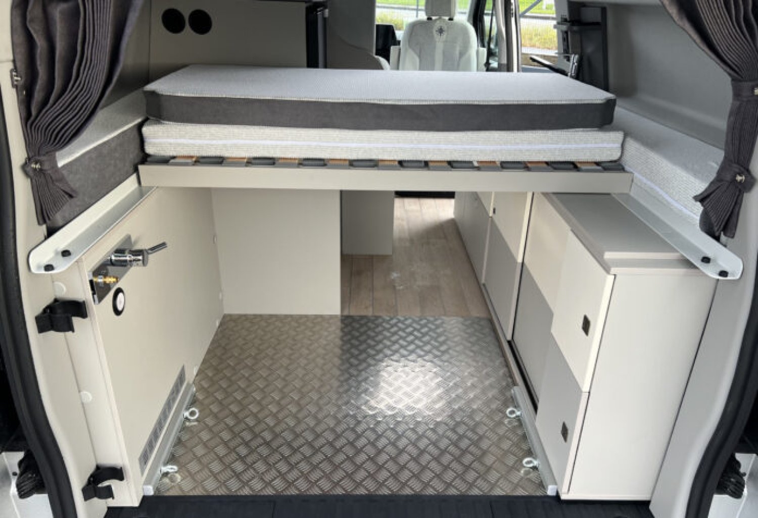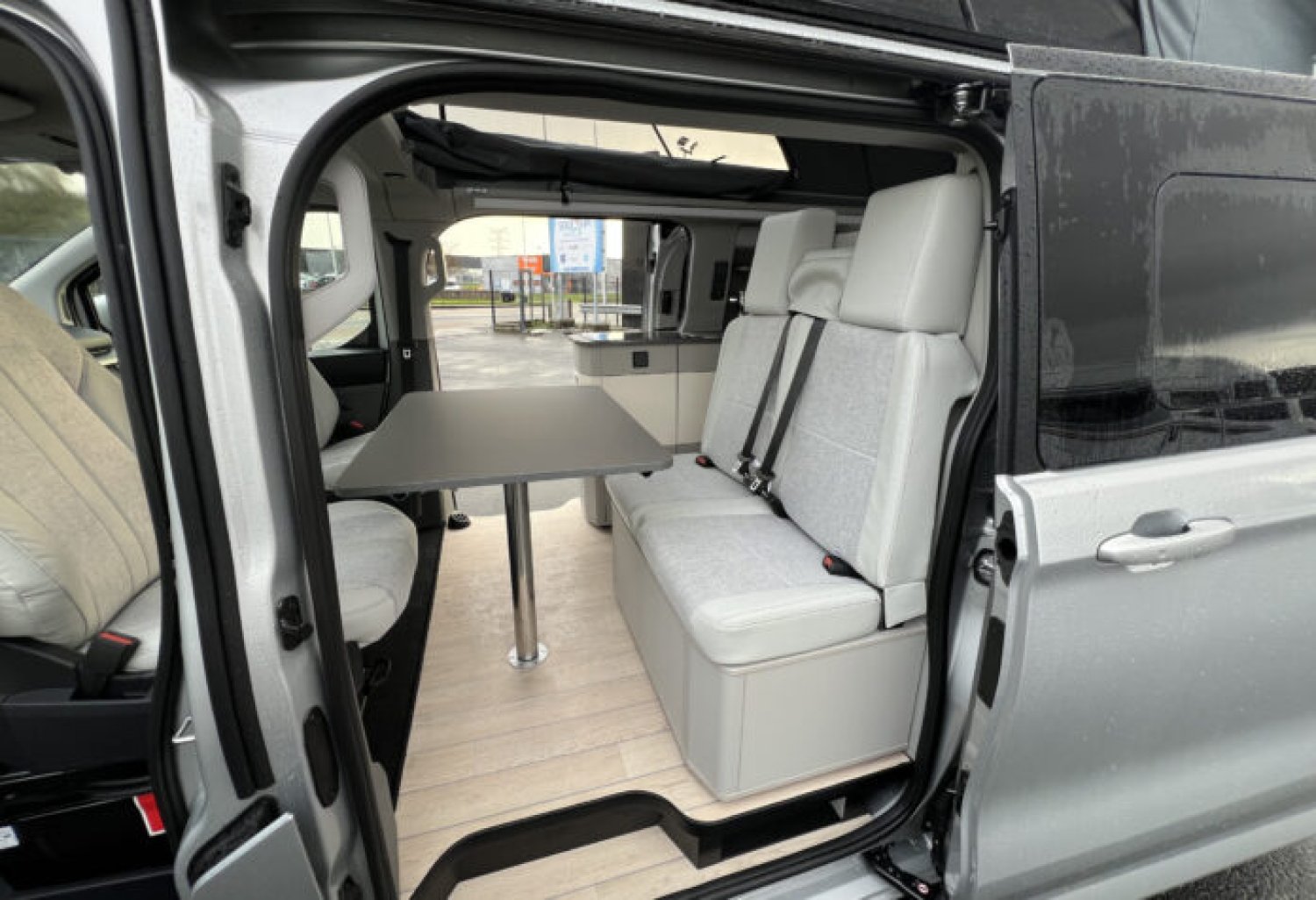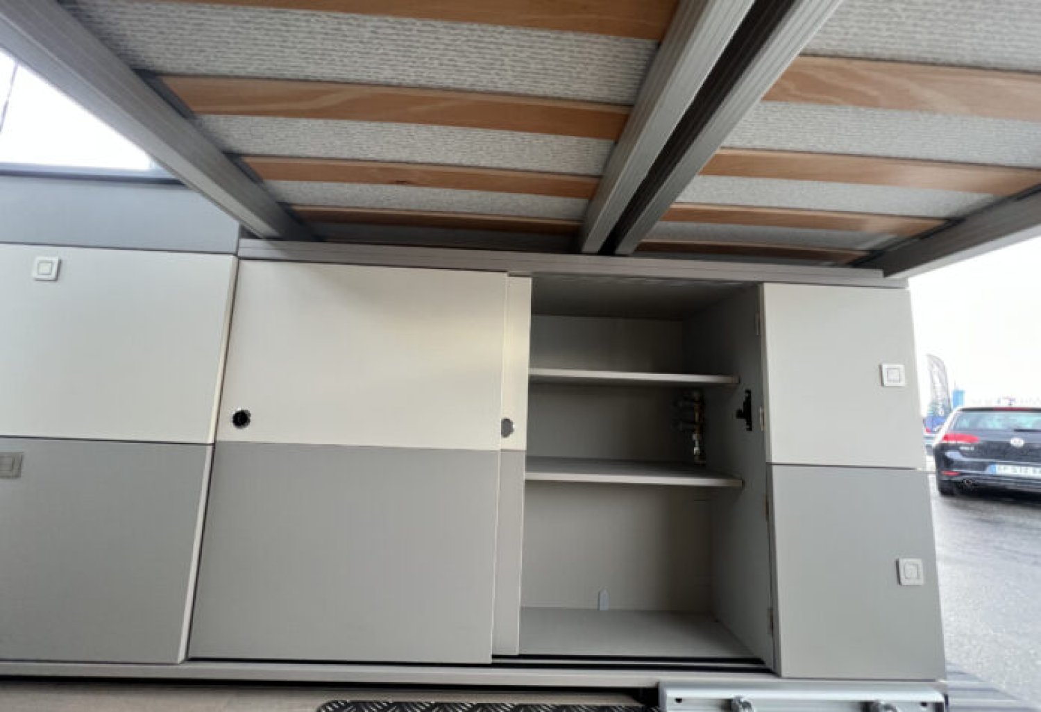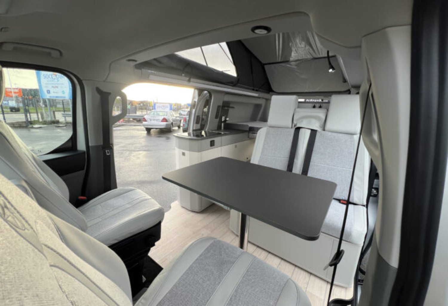 Pack Kipling (Soit : Batterie cellule AGM 92 Ah, chauffe-eau pour douche et évier, échelle de lit, kit outdoor (tables + 2 chaises de camping), portes latérales coulissantes droite et gauche, pré-disposition électrique panneau solaire et attelage, rails latéraux soute avec crochets d'arrimage, rideaux arrière latéraux opacifiant, sellerie bi-matière « Missouri », tapis de cabine, variateur d'intensité lumière LED)
