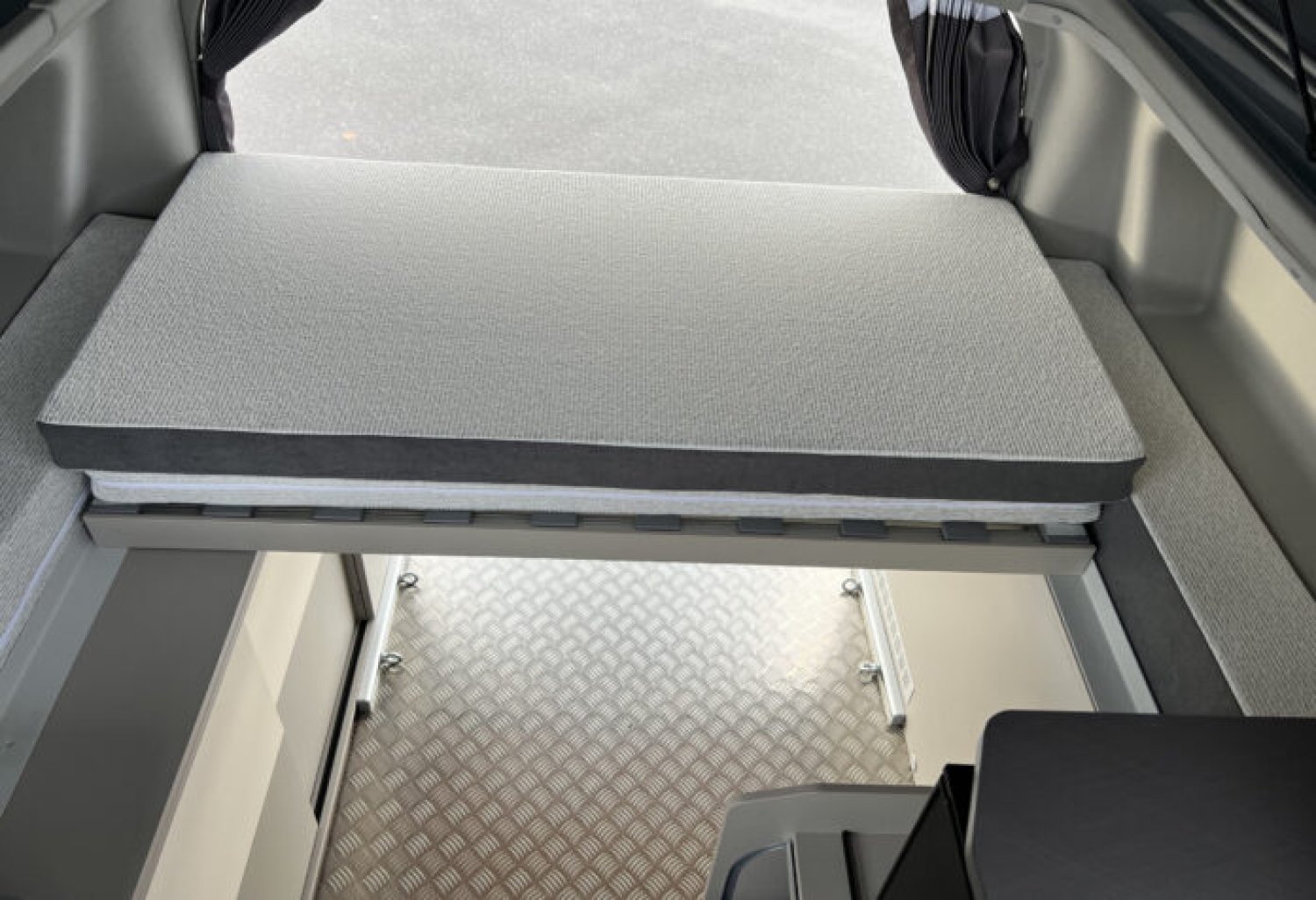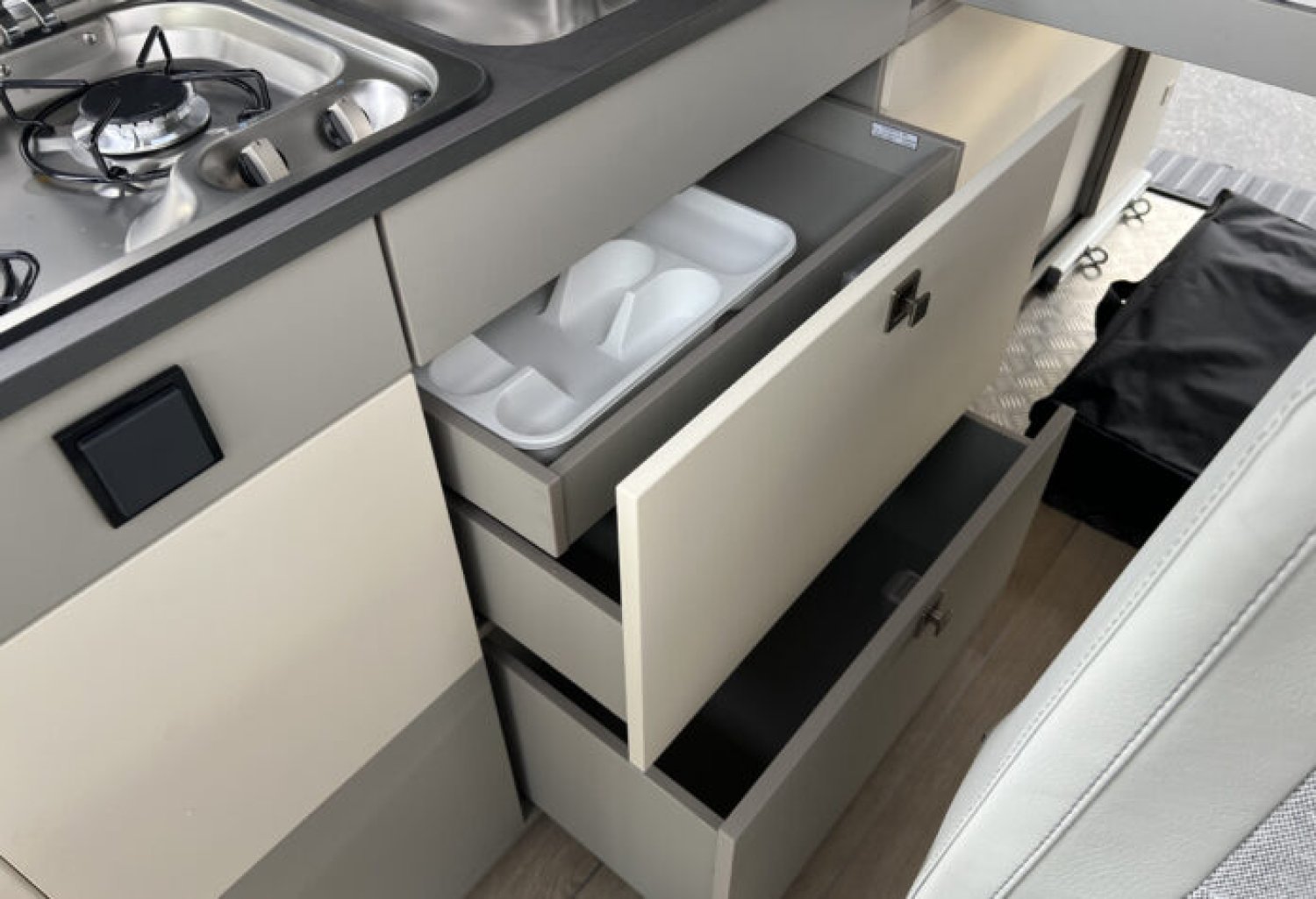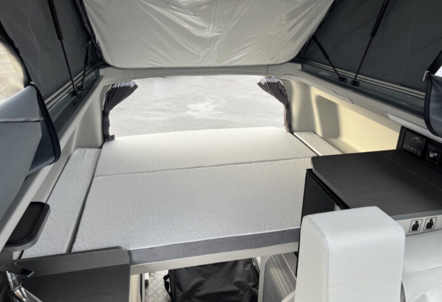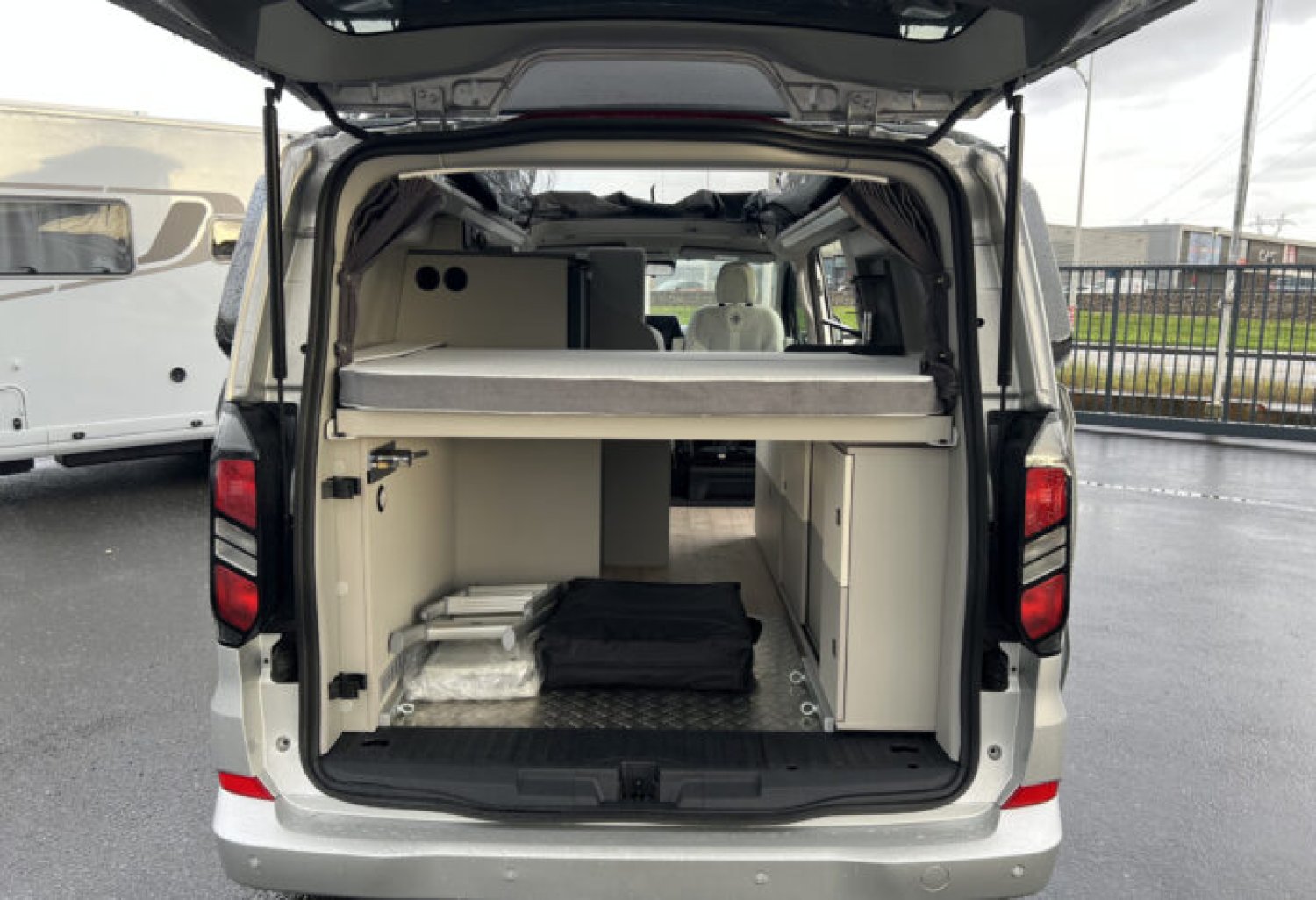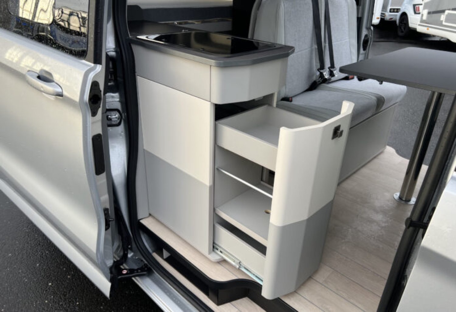 Pack Kipling (Soit : Batterie cellule AGM 92 Ah, chauffe-eau pour douche et évier, échelle de lit, kit outdoor (tables + 2 chaises de camping), portes latérales coulissantes droite et gauche, pré-disposition électrique panneau solaire et attelage, rails latéraux soute avec crochets d'arrimage, rideaux arrière latéraux opacifiant, sellerie bi-matière « Missouri », tapis de cabine, variateur d'intensité lumière LED)