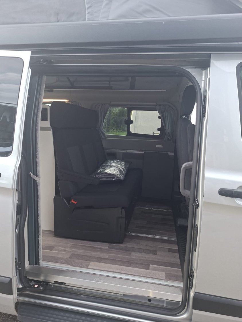 Van à toit relevable en très bon état sur Transit Custom 130 cv Boite automatique avec cuisine en L arrière équipée d'un frigo à compression et d'une plaque de cuisson 2 feux, et salon avant avec sièges pivotants.