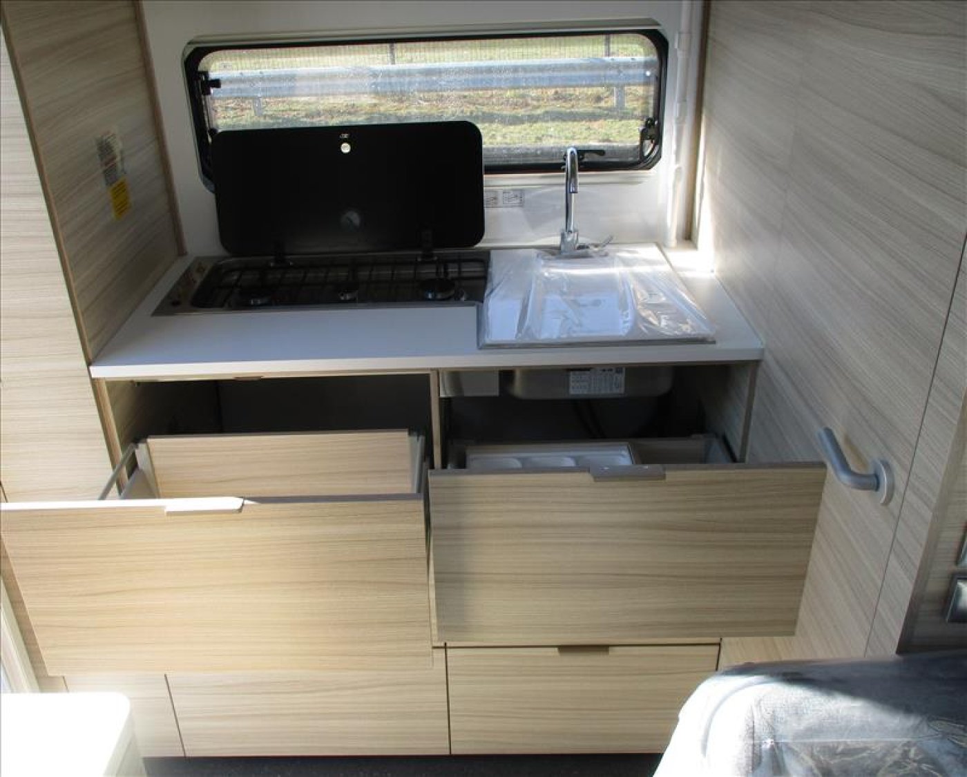 VERSION AVEC LIT CENTRAL AVANT /SALON U LATERAL ET CUISINE ARRIERE .BEAUCOUP DE RANGEMENTS EGALEMENT .BREF TOUT Y EST