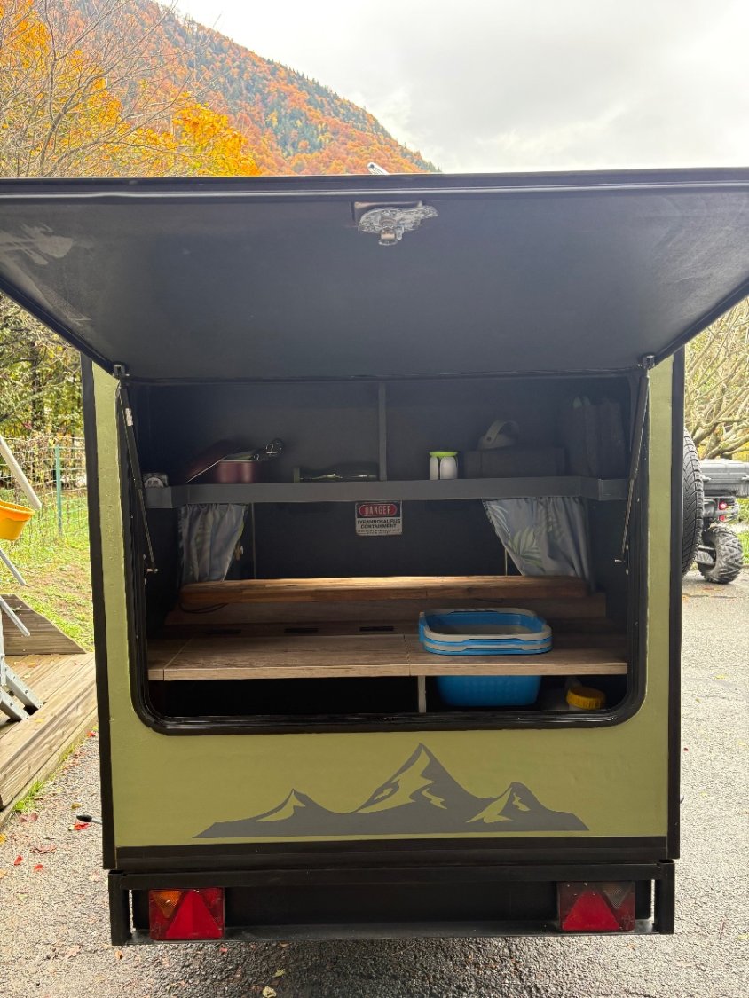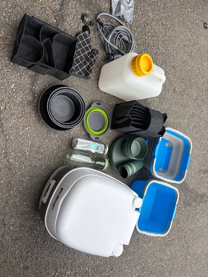 Réserve d’eau de 20l avec douchette 12v , 2 cuvettes, espace pour mettre une glacière à compression (vendu sans), plusieurs branchements 12v , vendu avec plusieurs assiettes, verres, bols, couverts, poêle, casseroles, passoire…