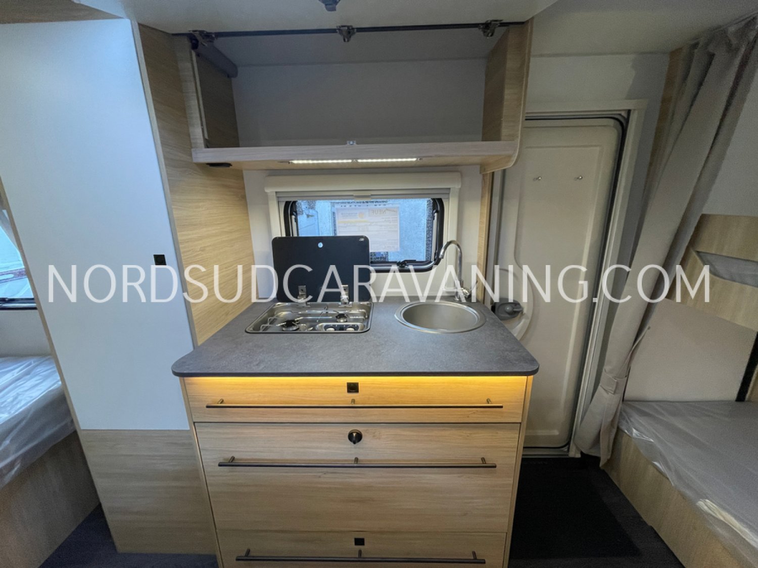 Cette caravane rigide CARAVELAIR ALBA 466 est très agréable à vivre. Très bel espace nuit avec son lit transversal et ses nombreux rangements, vous vous sentirez comme à la maison. Cuisine équipée avec un réfrigérateur 150 L, réchaud 2 feux gaz avec couvercle en verre, évier cuve inox. Elle a également un joli coin salle de bain, avec son toilette et son bac à douche.