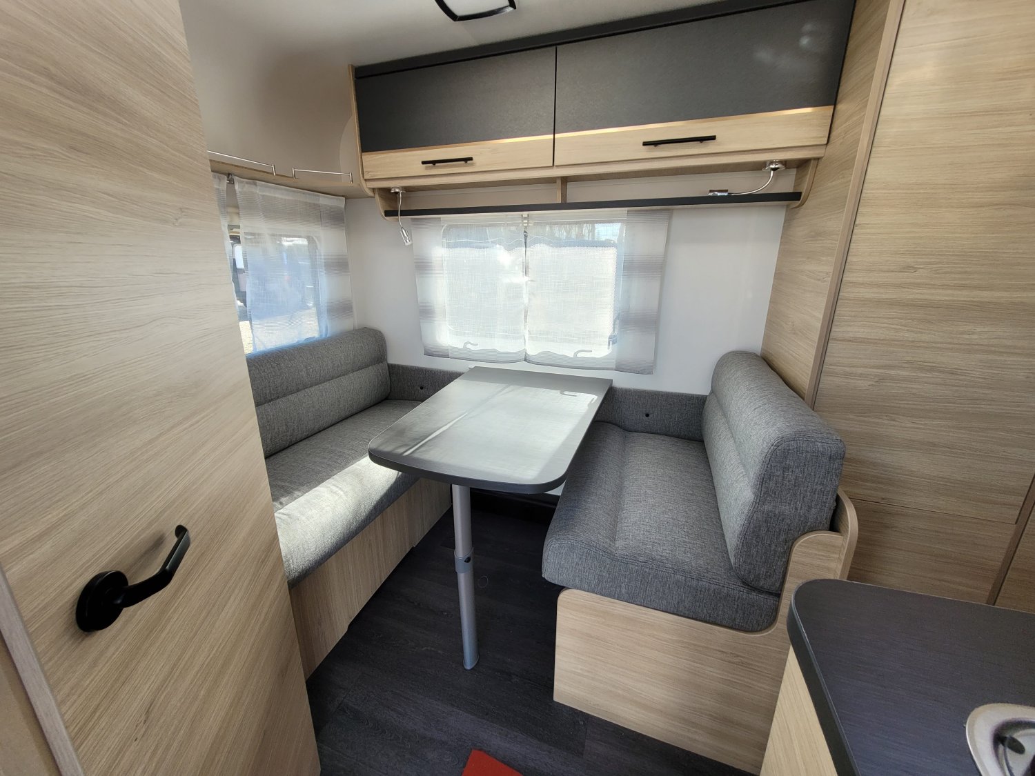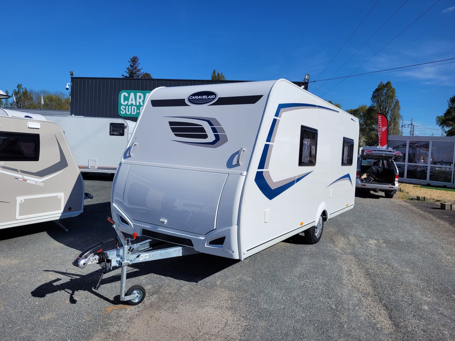 Caravane d'occasion très récente de la marque française Caravelair. Compact, avec un lit central et une climatisation !