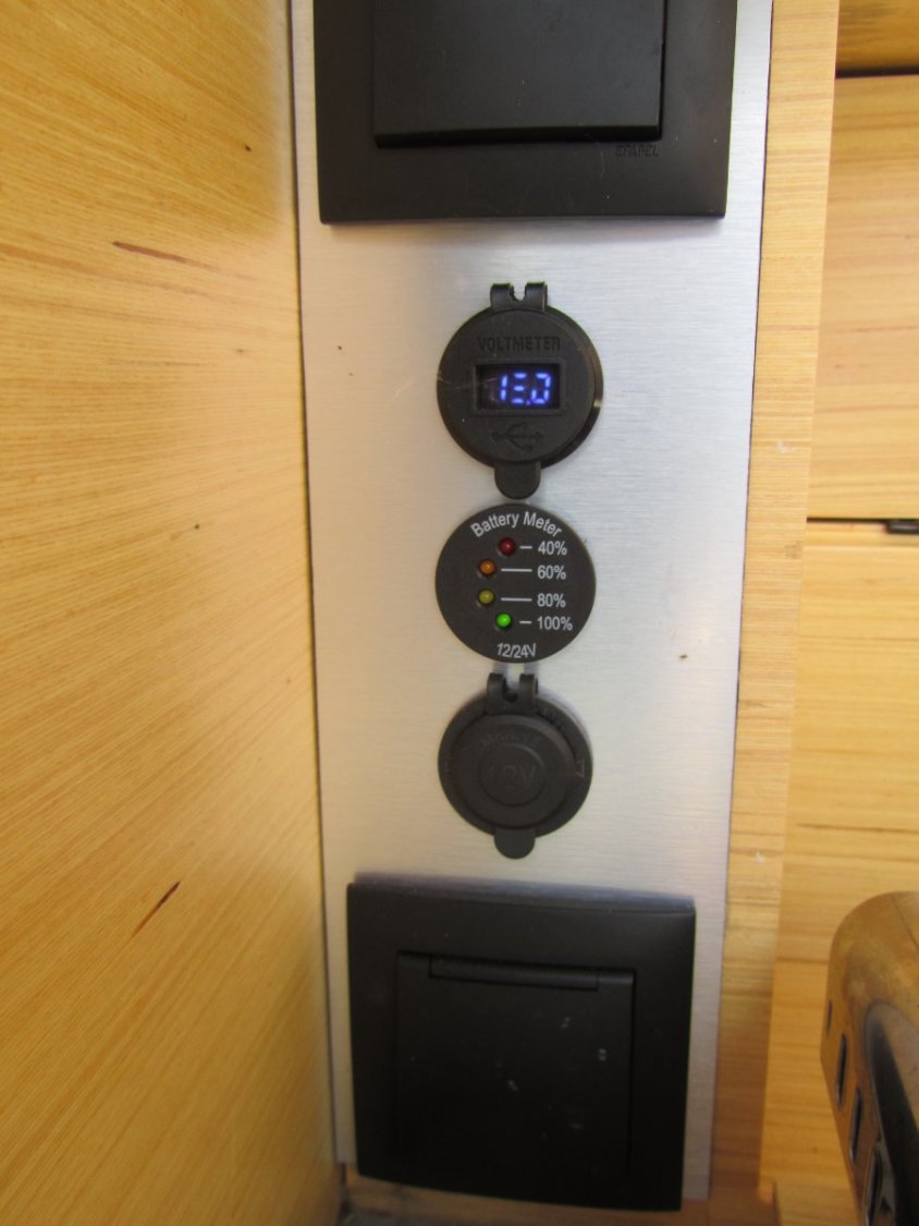 La partie « chambre » possède des prises pour recharger les mobiles ou autre tablette. Dans la cuisinette, le réfrigérateur fonctionne aussi en congélateur si nécessaire. Bien sûr, il existe une réserve d’eau (propre et sale séparée).
