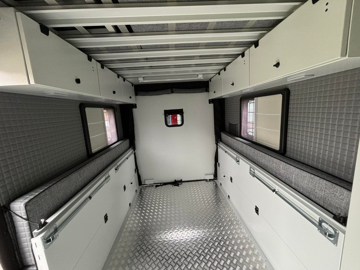 - Fenêtres latérales avec ouverture coulissante, moustiquaire, store occultant et grille de protection