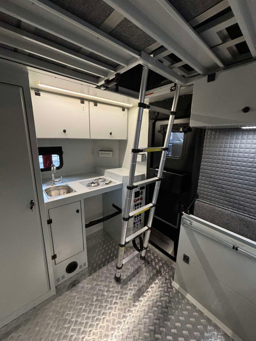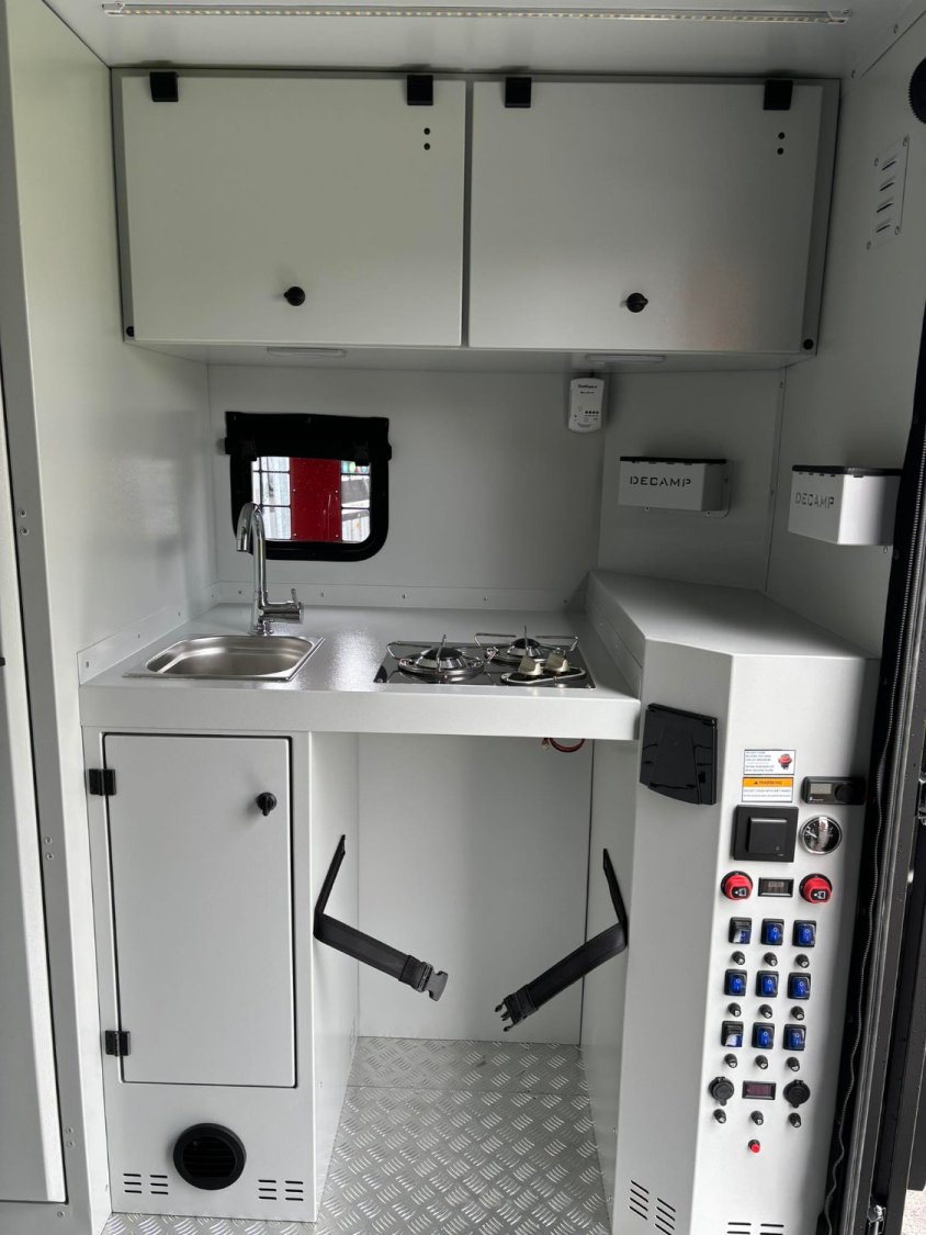 - Cuisine : 2 brûleurs gaz, évier couleur chrome, petit espace de plan de travail, rangements, prises 220V et USB