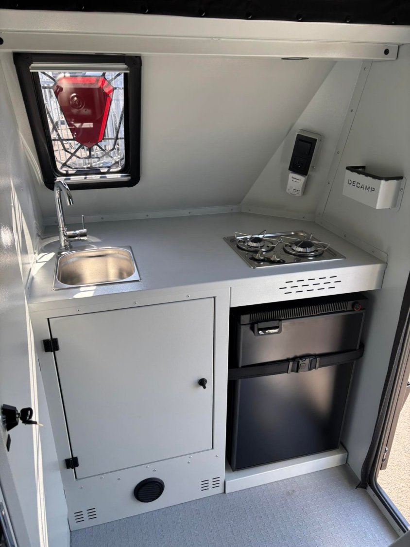 - Cuisine : 2 brûleurs gaz, évier couleur chrome, petit espace de plan de travail, rangements, prises 220V et USB