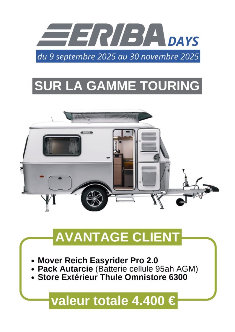 - Pack "Confort Eriba Touring" (moustiquaire de porte cellule, stores plissés confort, prises supplémentaires, couvercle évier avec planche à découper, poubelle intégrée à la porte cellule, miroir grossissant supplémentaire à fixation magnétique),
