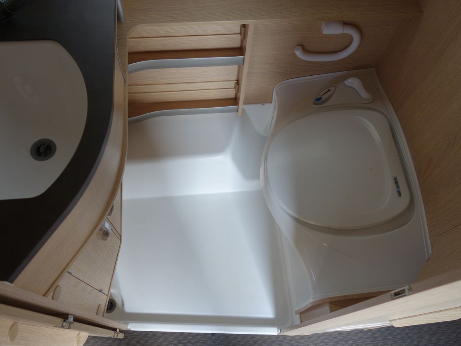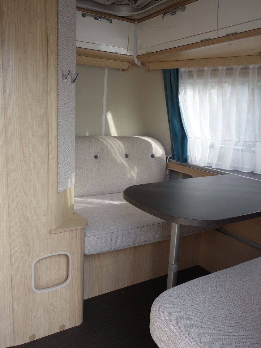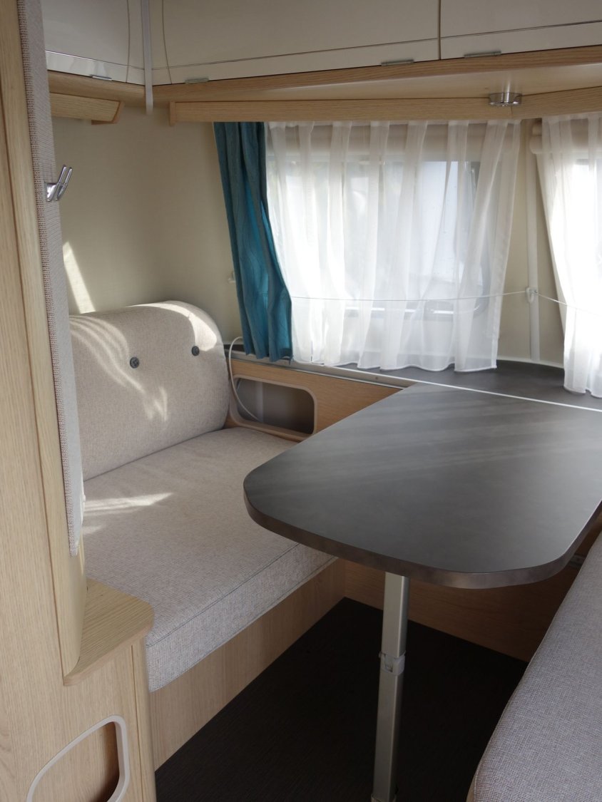 Caravane surbaissée avec grand lit transversal et dinette convertible, cabinet de toilette avec WC et douche, équipements: store, auvant gonflable, moover TRUMA XT tout automatique, antenne satellite sur trépied, TV, roue de secours, jantes alliage.