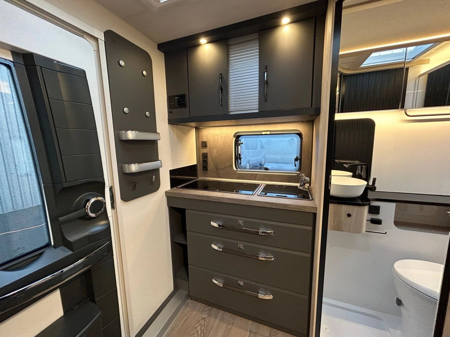 Crédence de cuisine, avec moustiquaire et store occultant complètement intégrés, lampe de cuisine, prises 230 V et prise USB de chargement