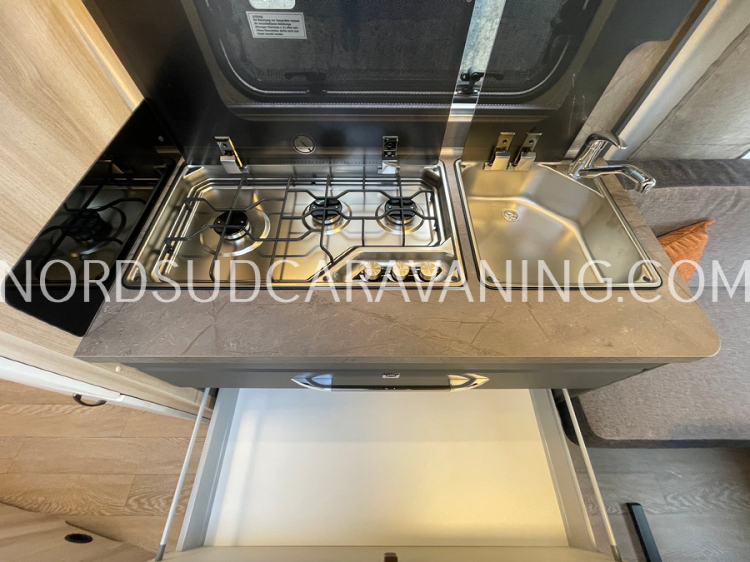 Pratique avec ses nombreux rangements, elle est très fonctionnelle avec sa cuisine équipée d’un réchaud 3 feux et évier inox protégés par un couvercle en verre et d’un réfrigérateur à absorption 133L.