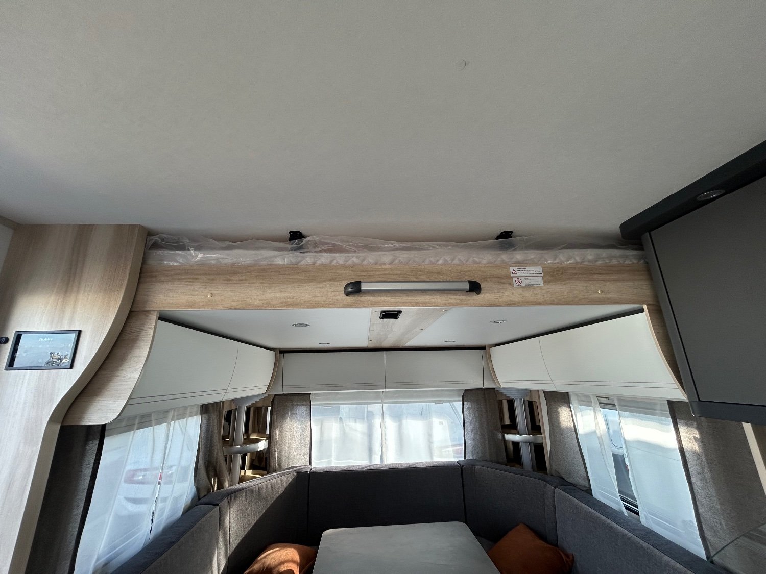 Caravane HOBBY , vous offrant un salon en U à l'arrière transformable en lit 2 places , au dessus de celui-ci un lit de pavillon manuel pour 2 autres personnes , au milieu sa cuisine et sa salle d'eau avec wc , à l'avant 2 lits jumeaux pour un confort de couchage optimal . Cette caravane peut donc accueillir 6 personnes pour la nuit.