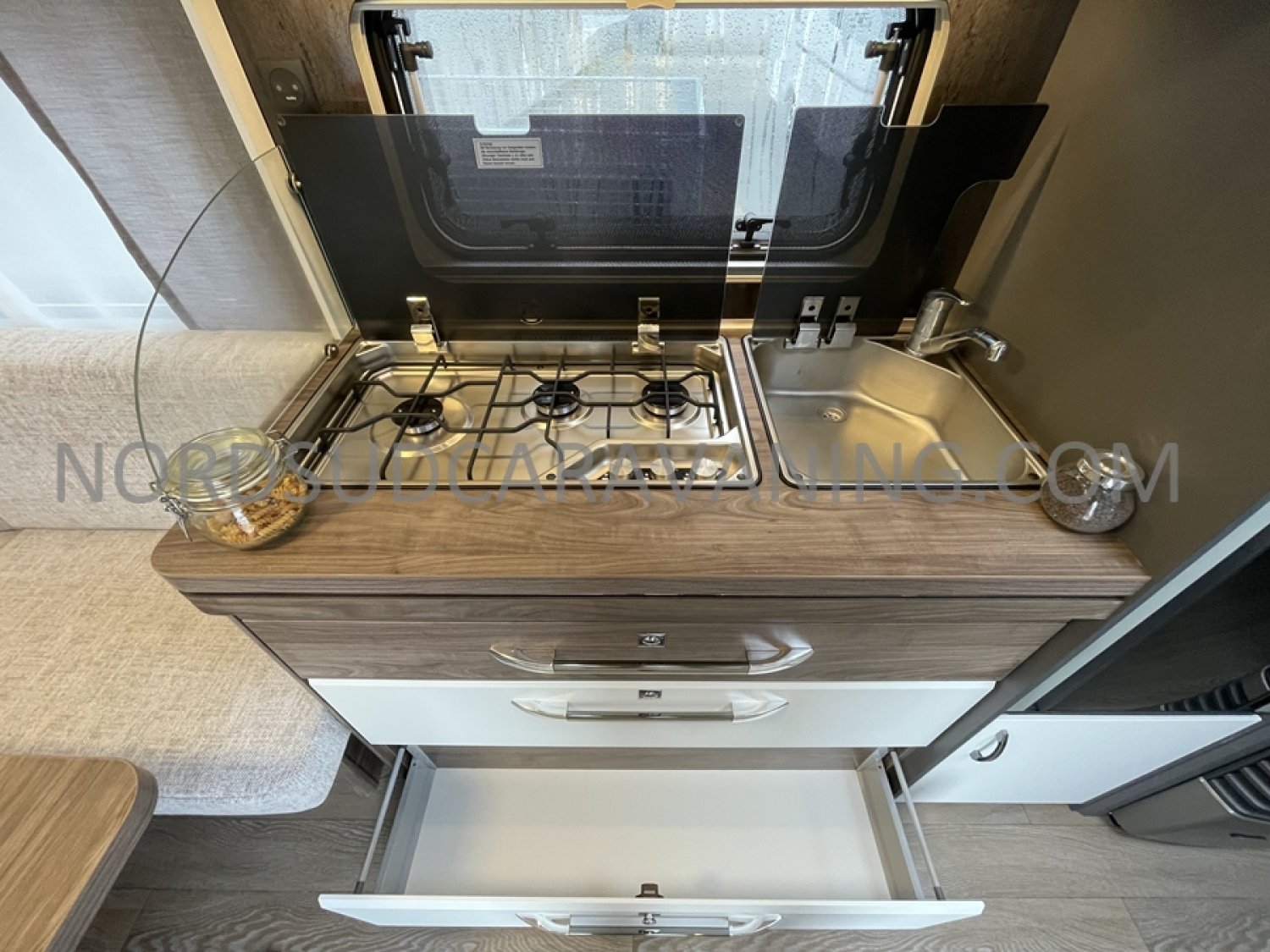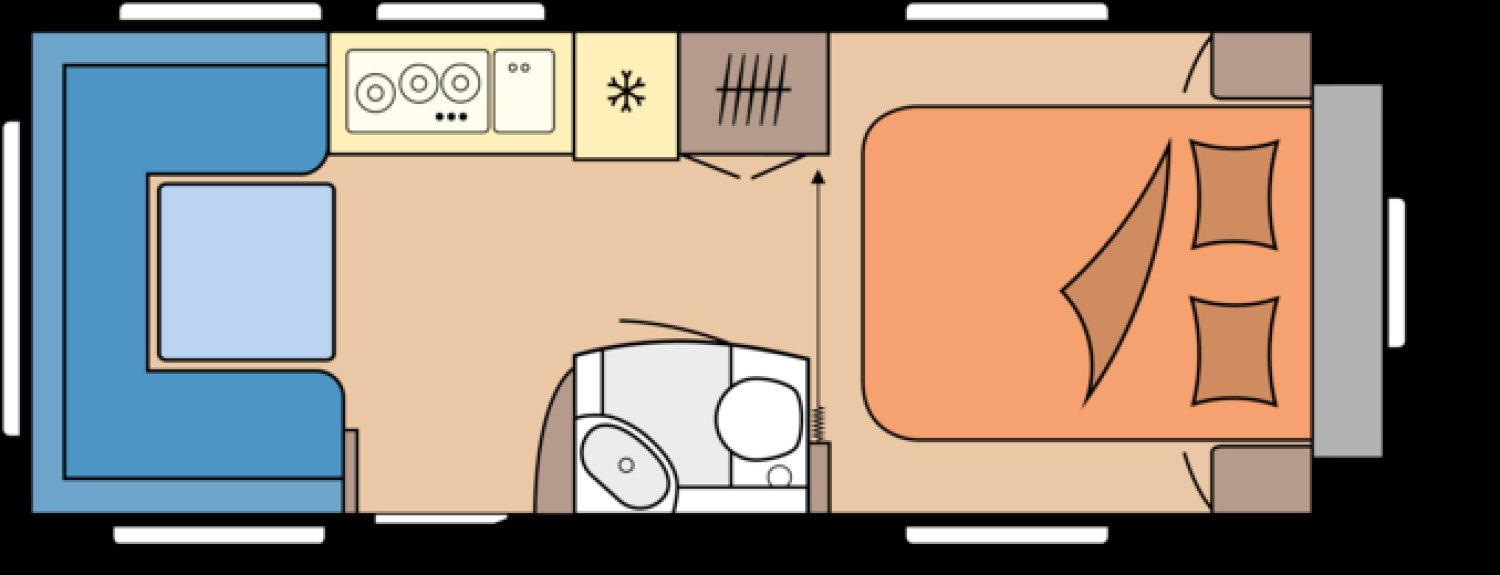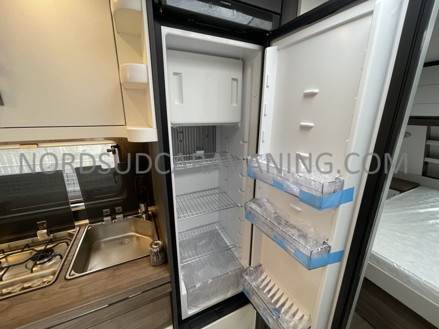 Cette superbe caravane est dotée d’un joli salon en U spacieux et convivial pour en profitez en couple, en famille ou entre amis. Il est transformable en couchage pour deux personnes. Son lit central vous permettra de profiter d'un espace de repos confortable facilement accessible des deux côtés et avec de multiples espaces de rangement. Sa cuisine équipée d’un réchaud 3 feux, d’un évier, d’un réfrigérateur congélateur avec double ouverture, qui ravira le cuisinier ou la cuisinière. Elle dispose également d'une salle de bain compacte, équipée d’un WC, d'un lavabo et d'un bac de propreté qui vous apportera un maximum de confort.