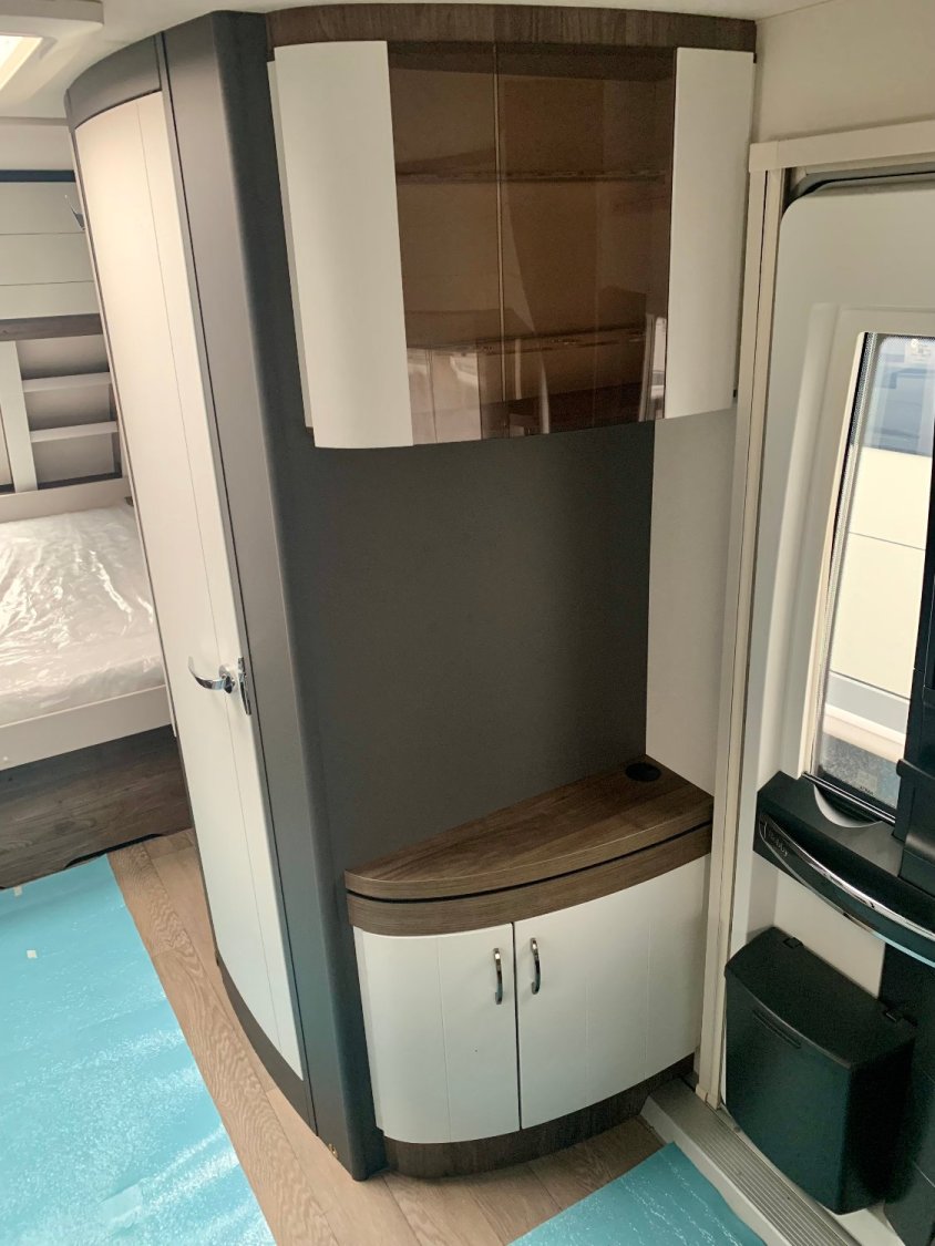 Rangement de pavillon spacieux , Rangement sous banquette , Réchaud 3 feux et évier inox , Réfrigérateur Trimixt 133l compartiment congélateur 12l , Chauffage Truma avec air pulsé , Détecteur de fumée , Panneau de commande Hobby et BT Via Hobby Connect.
