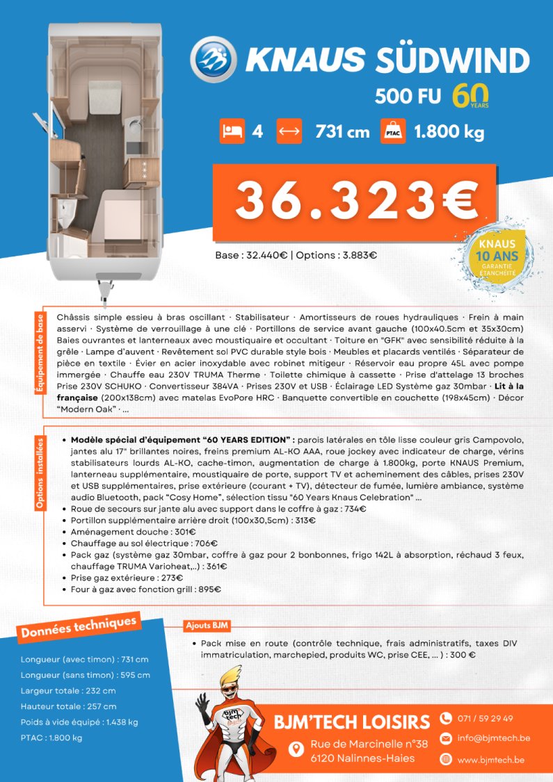 - Modèle spécial d’équipement “60 YEARS EDITION” : parois latérales en tôle lisse couleur gris Campovolo, jantes alu 17" brillantes noires, freins premium AL-KO AAA, roue jockey avec indicateur de charge, vérins stabilisateurs lourds AL-KO, cache-timon, augmentation de charge à 1.800kg, porte KNAUS Premium, lanterneau supplémentaire, moustiquaire de porte, support TV et acheminement des câbles, prises 230V et USB supplémentaires, prise extérieure (courant + TV), détecteur de fumée, lumière ambiance, système audio Bluetooth, pack “Cosy Home”, sélection tissu "60 Years Knaus Celebration" ...