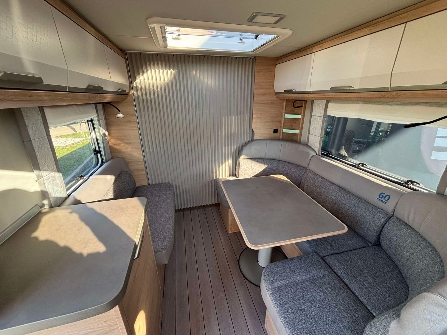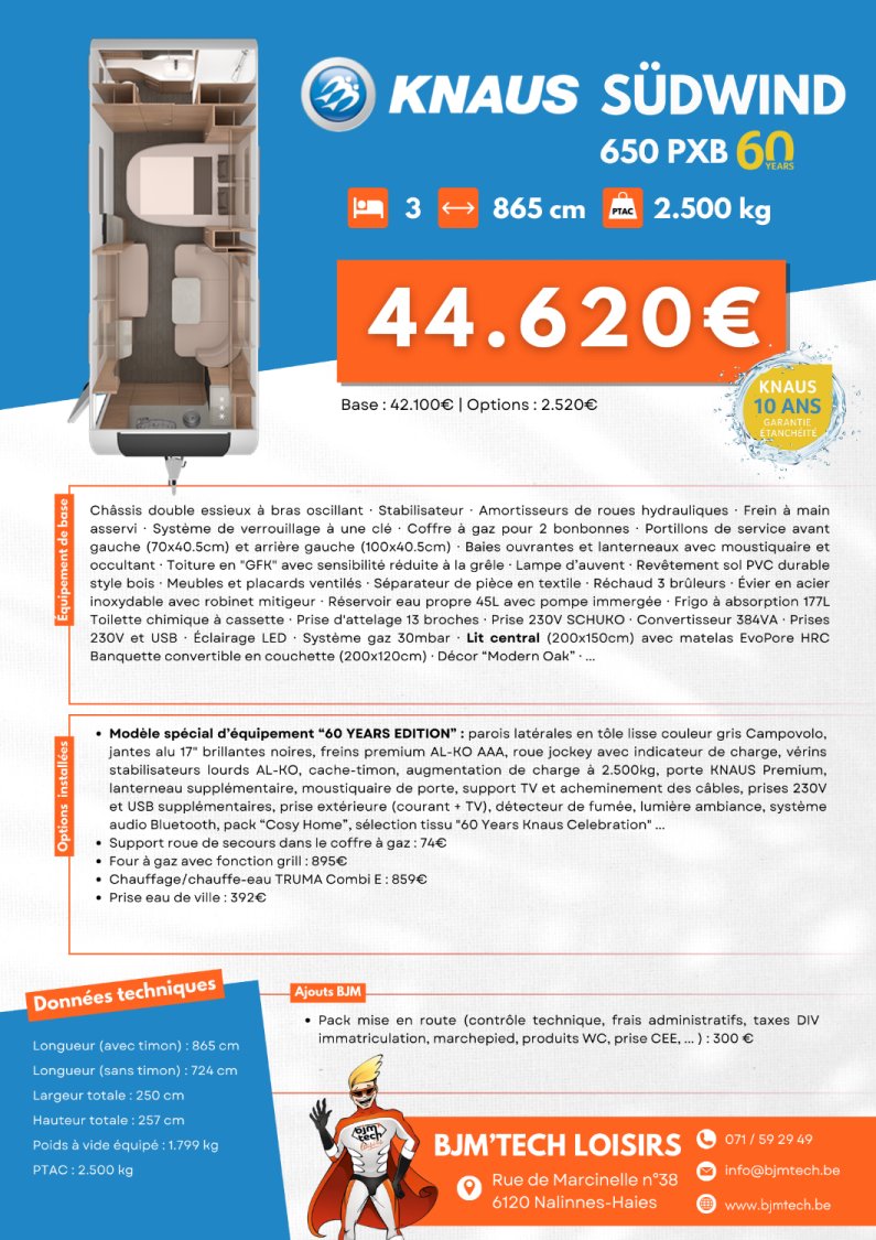 - Modèle spécial d’équipement “60 YEARS EDITION” : parois latérales en tôle lisse couleur gris Campovolo, jantes alu 17" brillantes noires, freins premium AL-KO AAA, roue jockey avec indicateur de charge, vérins stabilisateurs lourds AL-KO, cache-timon, augmentation de charge à 2.500kg, porte KNAUS Premium, lanterneau supplémentaire, moustiquaire de porte, support TV et acheminement des câbles, prises 230V et USB supplémentaires, prise extérieure (courant + TV), détecteur de fumée, lumière ambiance, système audio Bluetooth, pack “Cosy Home”, sélection tissu "60 Years Knaus Celebration" ...
