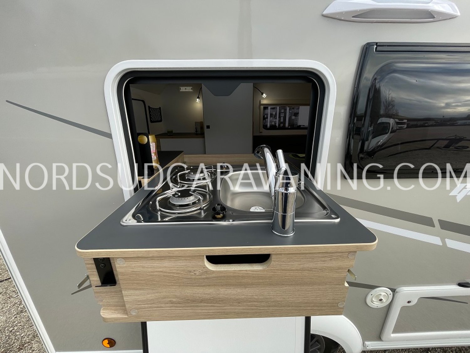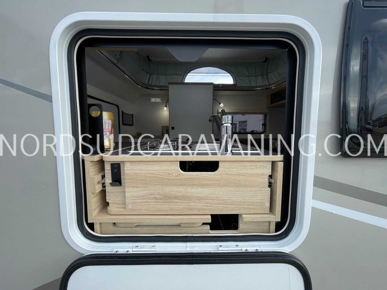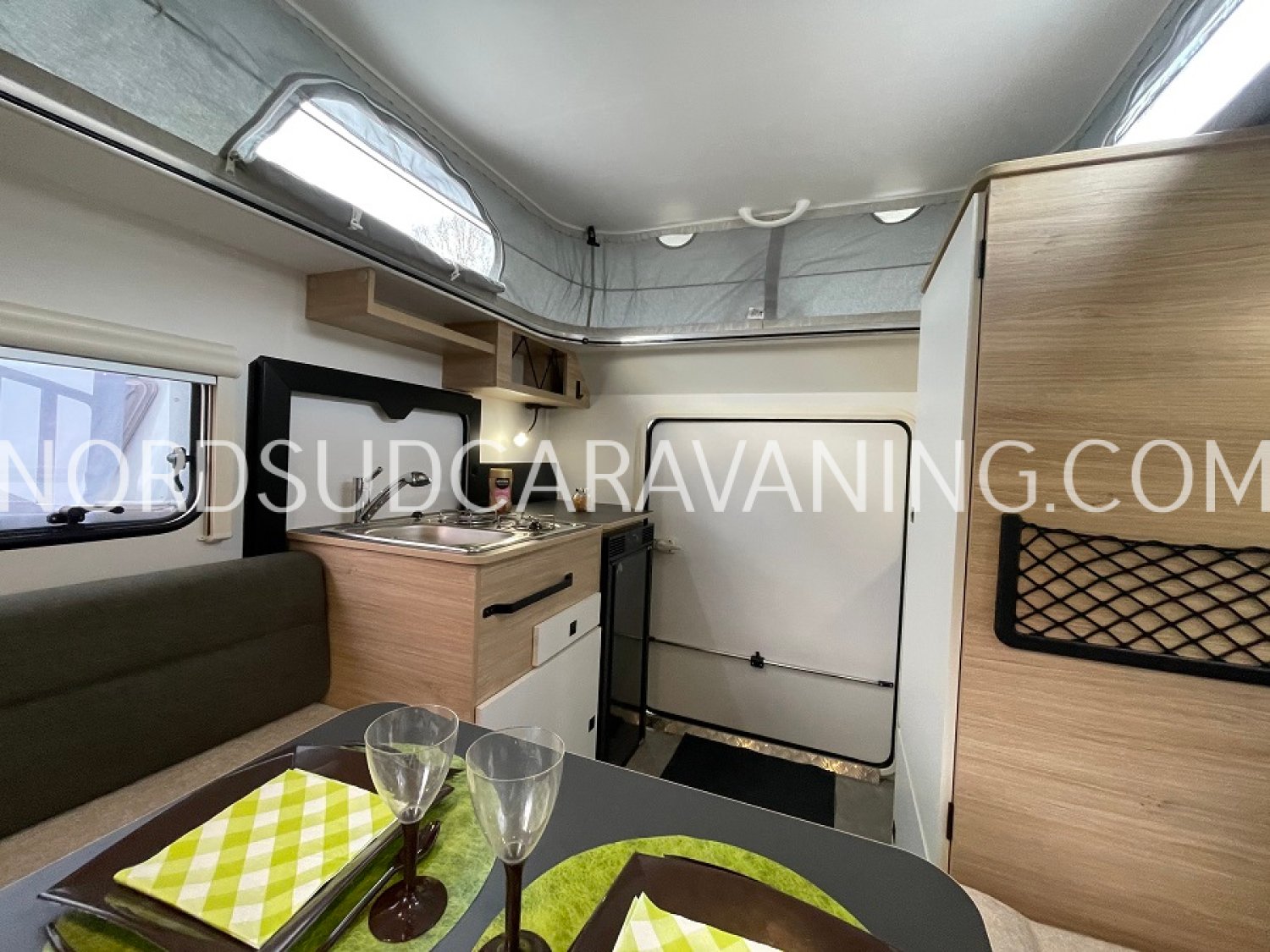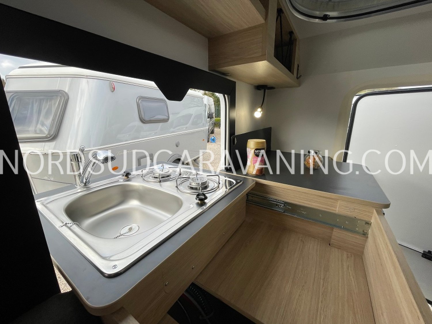 Moins de 3M de long mais tout le confort d’une grande. Elle dispose d’une dinette transformable en couchage 2 personnes, d’un bloc cuisine fonctionnel avec réchaud 2 feux, cuve inox avec le choix de cuisiner en intérieur ou à l'extérieur, un réfrigérateur, sans oublier ses nombreux rangements et sa porte cellule arrière large et accessible permettant de pouvoir rentrer des vélos, un scooter ou une moto.