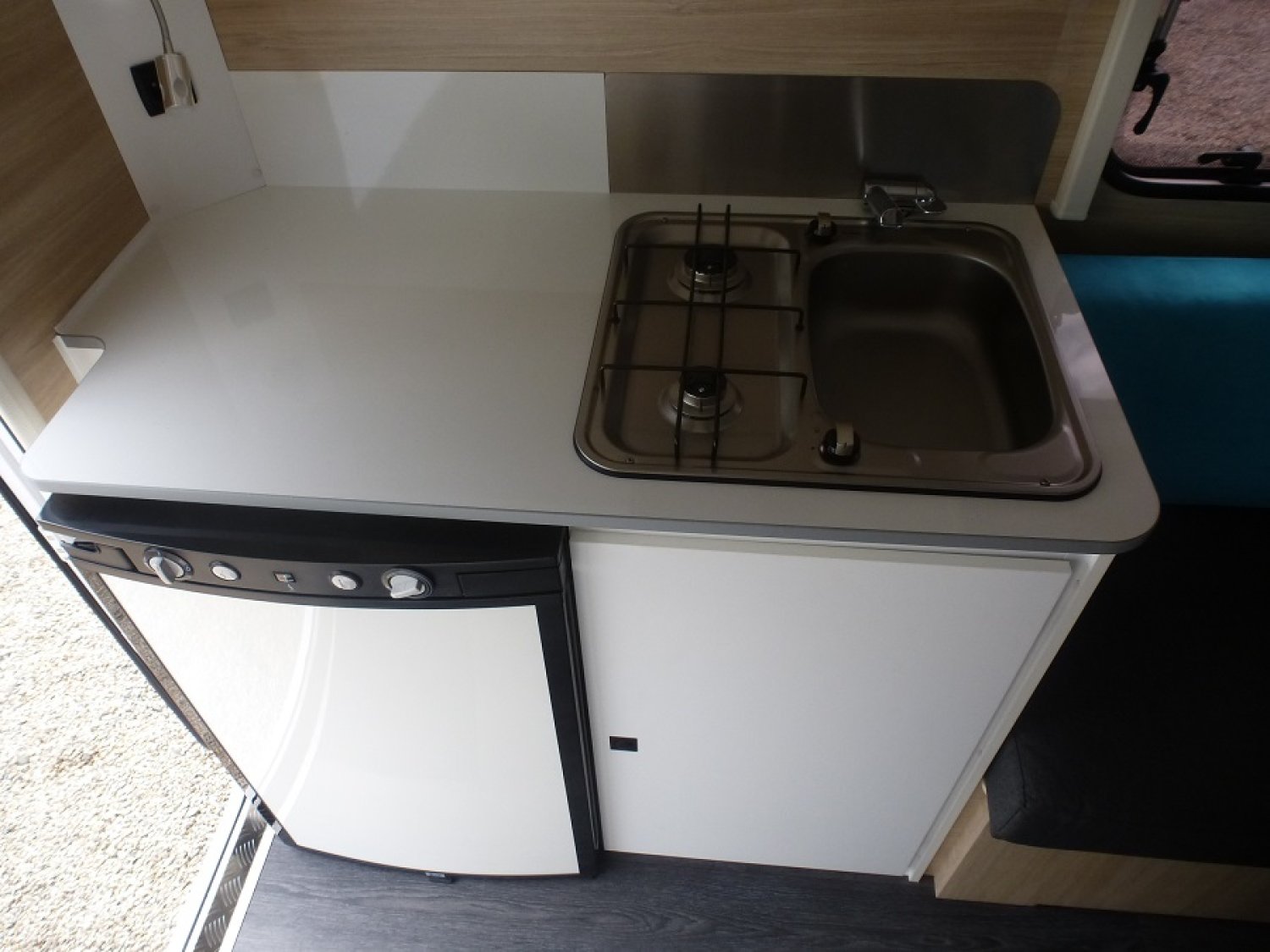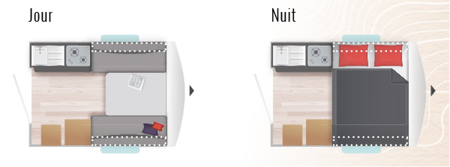Moins de 3M de long mais tout le confort d’une grande. Elle dispose d’une dinette transformable en couchage 2 personnes, d’un coin cuisine avec réchaud 2 feux, cuve inox et réfrigérateur 12/220/gaz, de nombreux rangements et une porte cellule arrière large et accessible permettant de pouvoir rentrer des vélos, un scooter ou une moto.