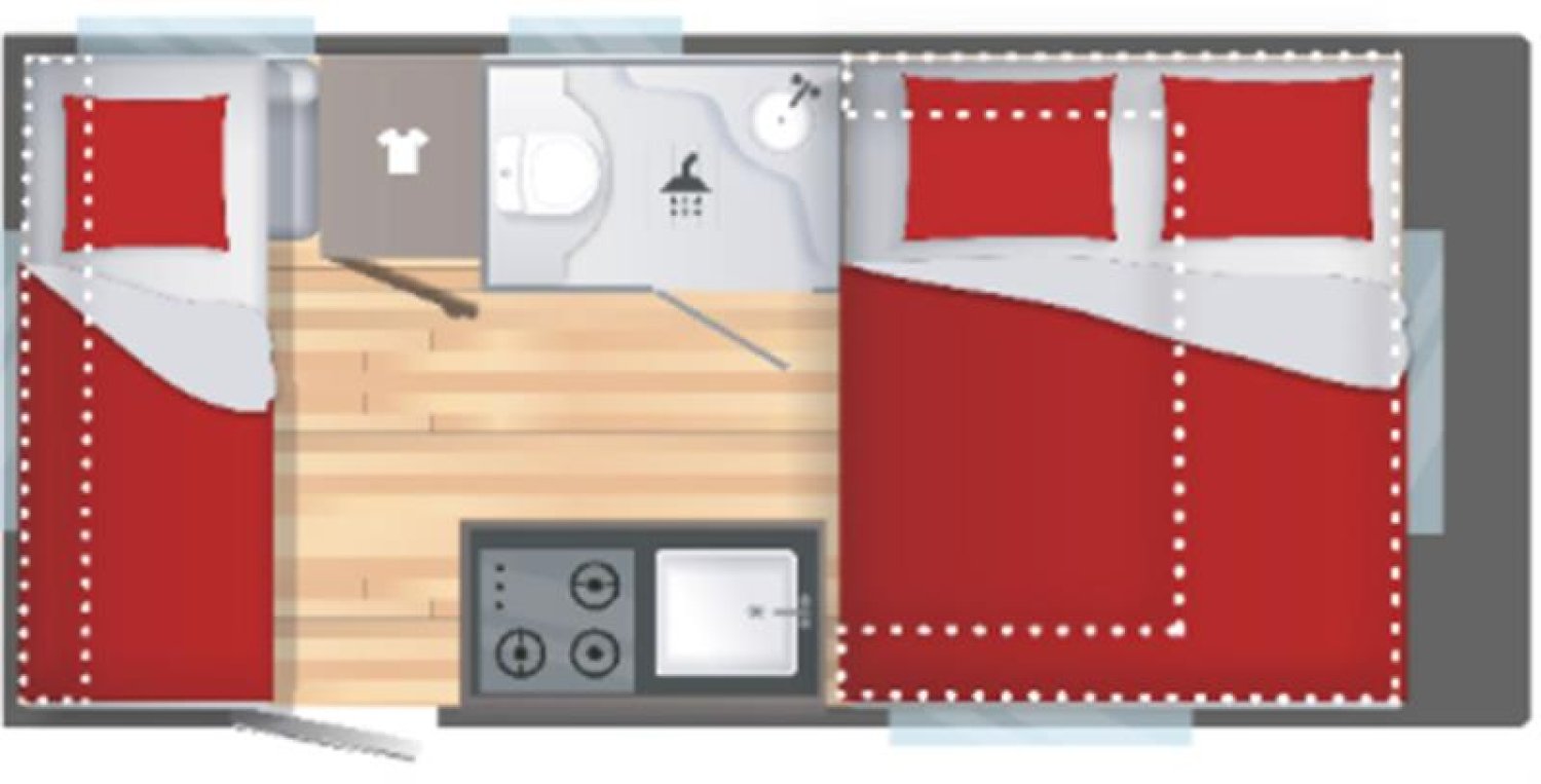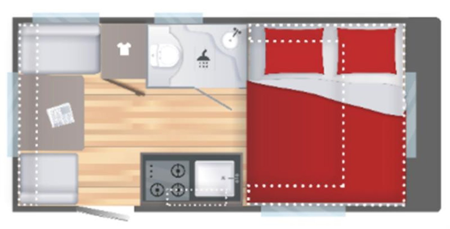 Bac à douche, Baie arrière/avant, Baies ouvrantes double vitrage, Châssis et timons galvanisés, Compartiment bouteille à gaz, Réchaud 3 feux inox, Réfrigérateur trimixte (12V 230V GAZ) 85L, Solant rehausse, Sommier à lattes avec compas de maintien, Parois latérales polyester, Transformateur 230/12V avec disjoncteur, WC à cassette, Pré-équipement TV: prises antenne et 230V, Store combi occultant + moustiquaire, Suspension roues indépendantes avec amortisseurs, Pack shower, Toit polyester, Prises 230V x5, Cuve inox, Dînette arrière transformable en couchage 190x675, Eclairage intérieur LED, Eclaireur d'auvent LED, Freinage par inertie recul automatique, Lit avant permanent 149 x187, Face avant polyester, Jantes Aluminium, Lavabo d'angle, Meuble de rangement sous lavabo, Pack safety, Levage du toit assisté par vérin à gaz, Spots de lecture LED prise USB