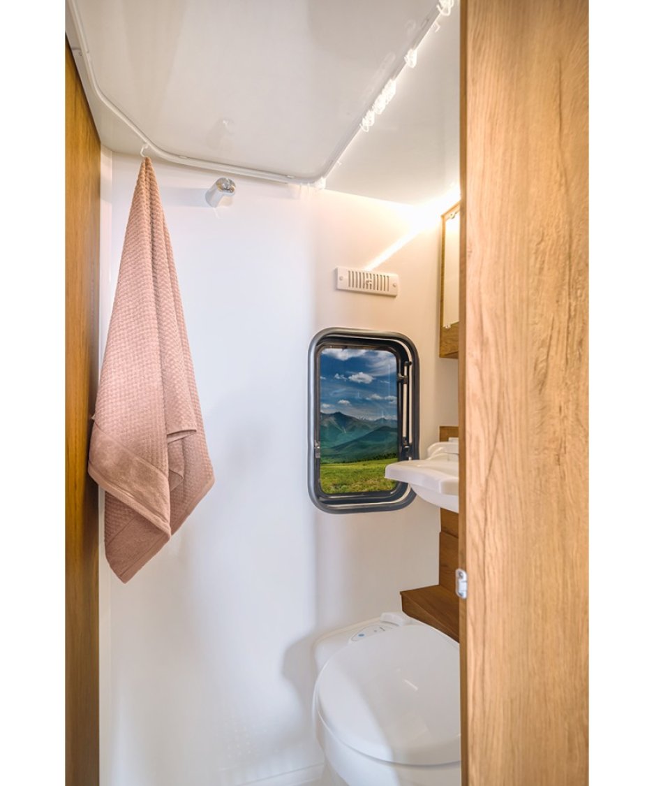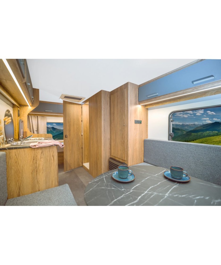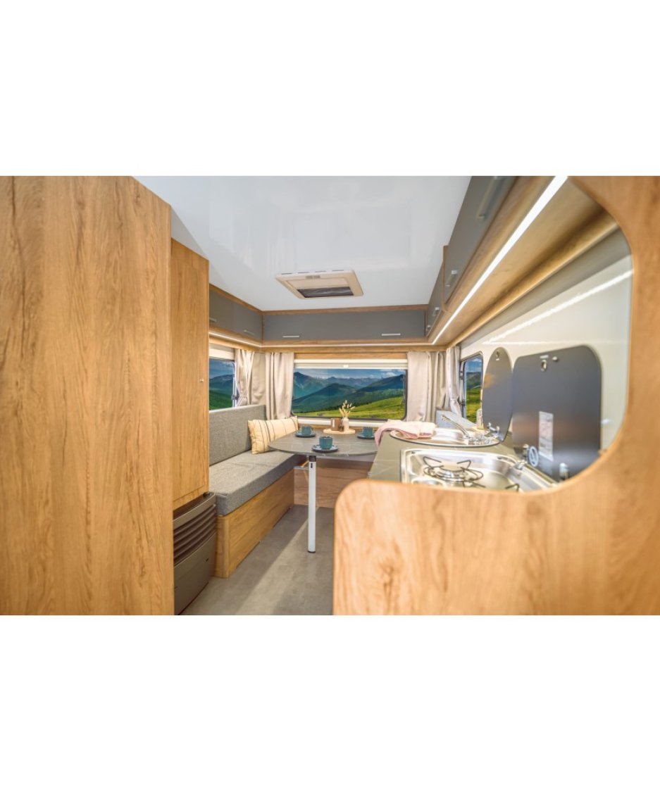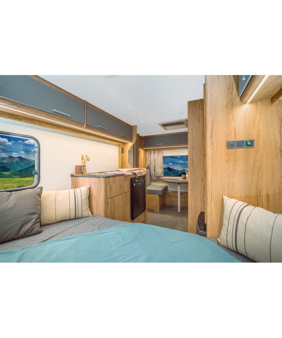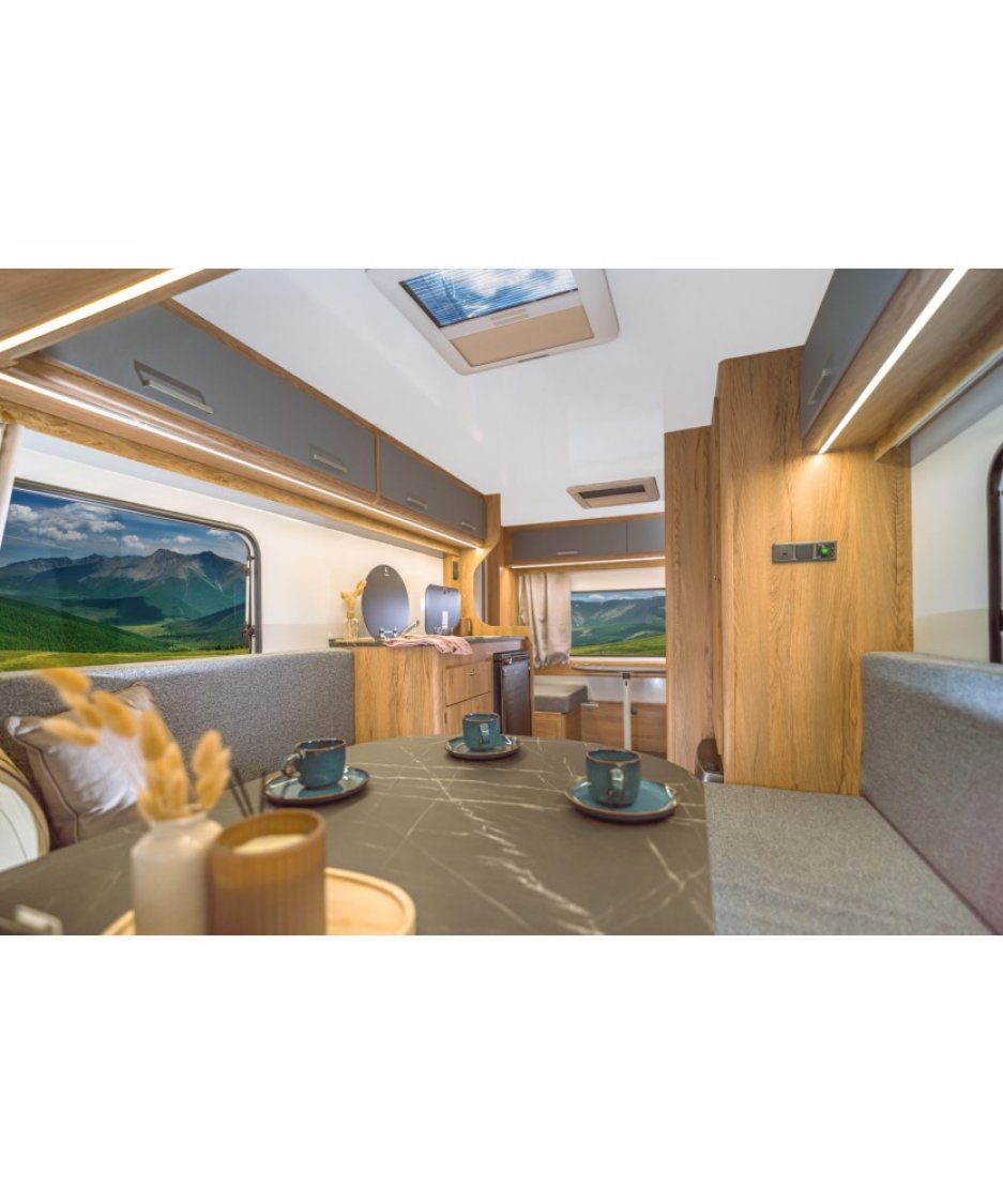 NIEWIADOW LAZUR : l'espace de vie comprend une table qui se transforme facilement en un confortable lit double ainsi qu'une autre table transformable en lit simple. La caravane est équipée d'une salle de bain avec WC, douche, chauffe eau. Tout le nécessaire pour voyager et vivre confortablement au quotidien