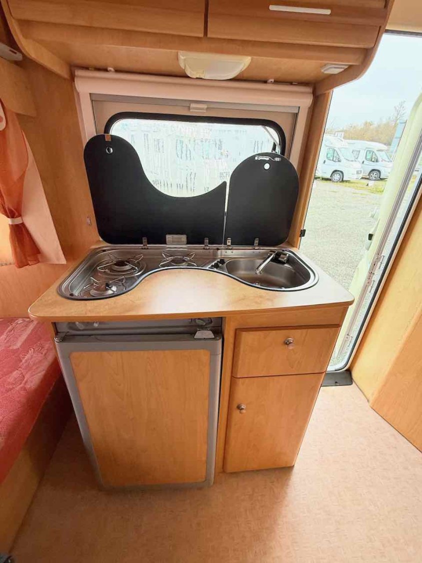 - La cuisine sur le flanc droit, au milieu. La cuisine est équipée d’un réchaud 3 feux, d’un évier et d’un réfrigérateur trimixte 81 L.