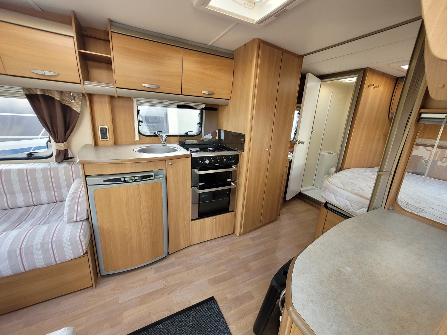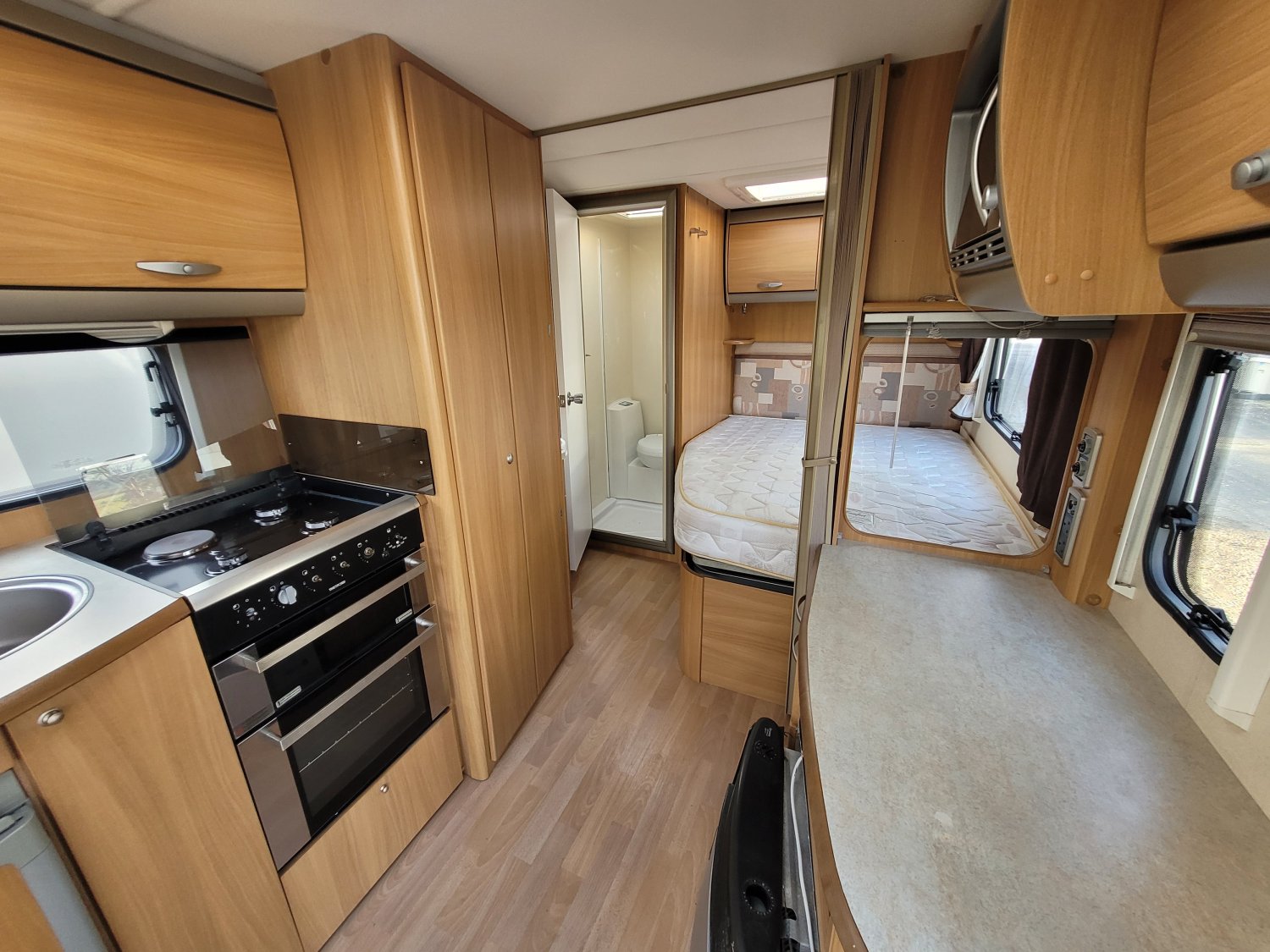 Caravane anglaise de la marque Swift. Implantation en lit à la française, avec moover, four, micro-onde, douche et radio.