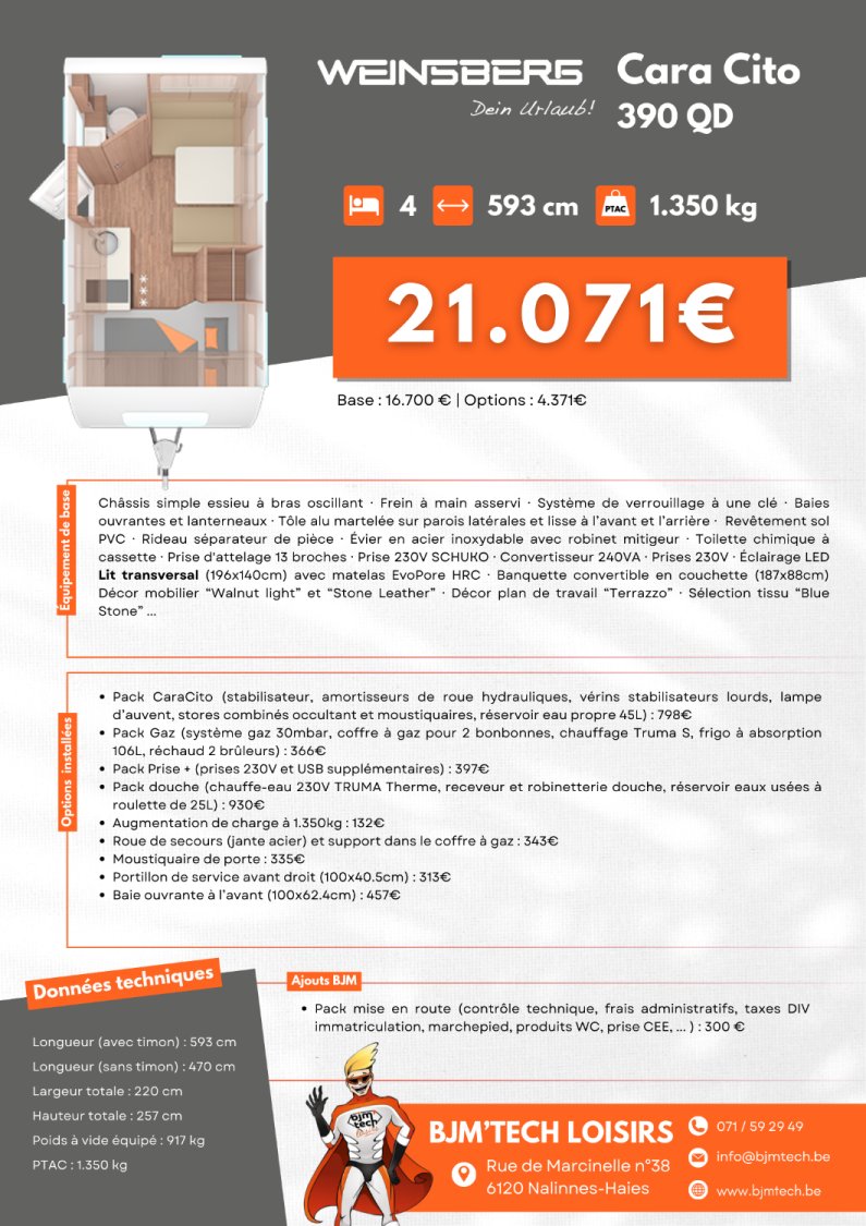- Pack CaraCito (stabilisateur, amortisseurs de roue hydrauliques, vérins stabilisateurs lourds, lampe d’auvent, stores combinés occultant et moustiquaires, réservoir eau propre 45L) : 798€