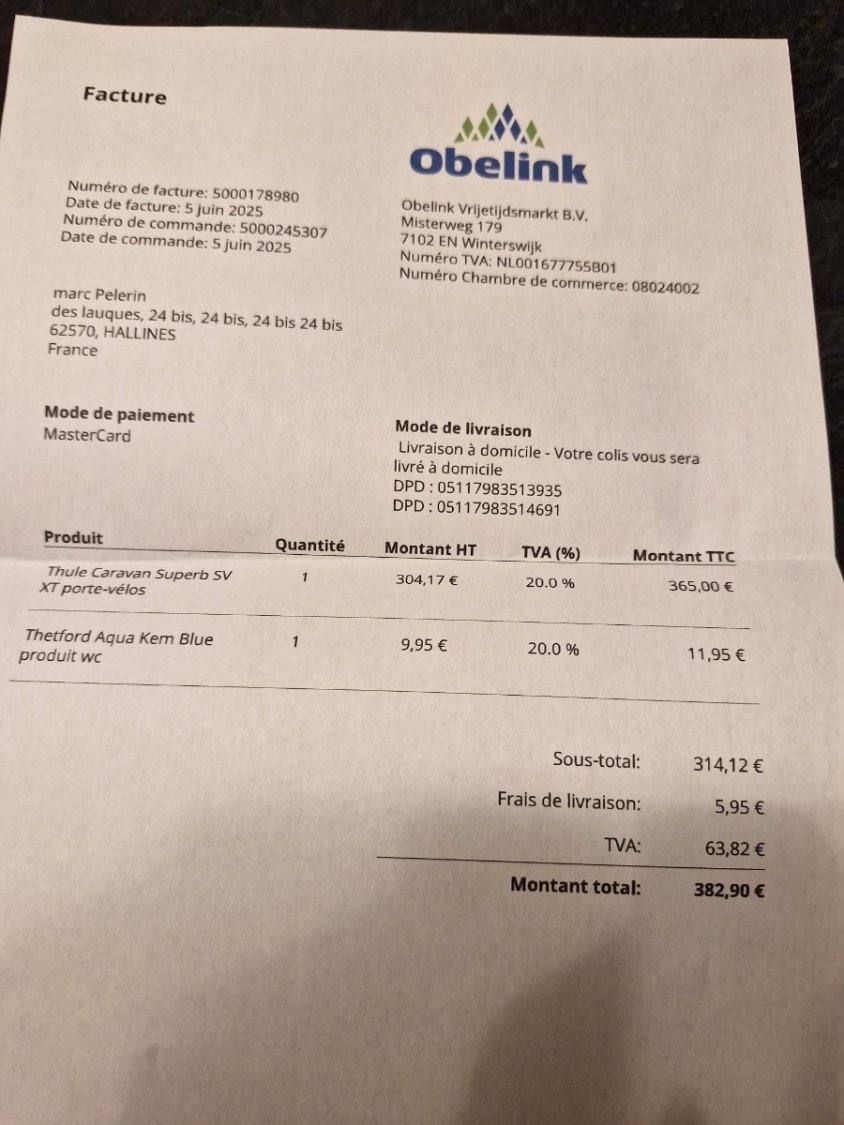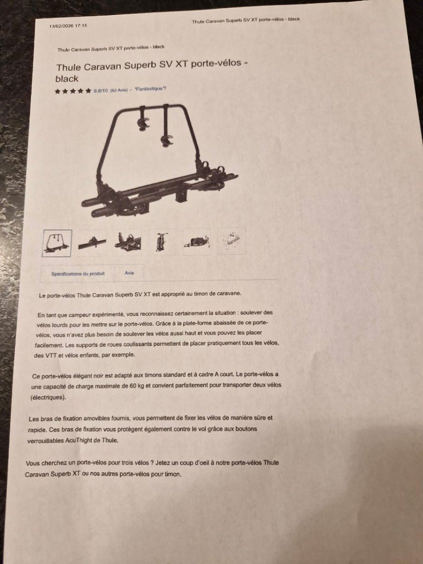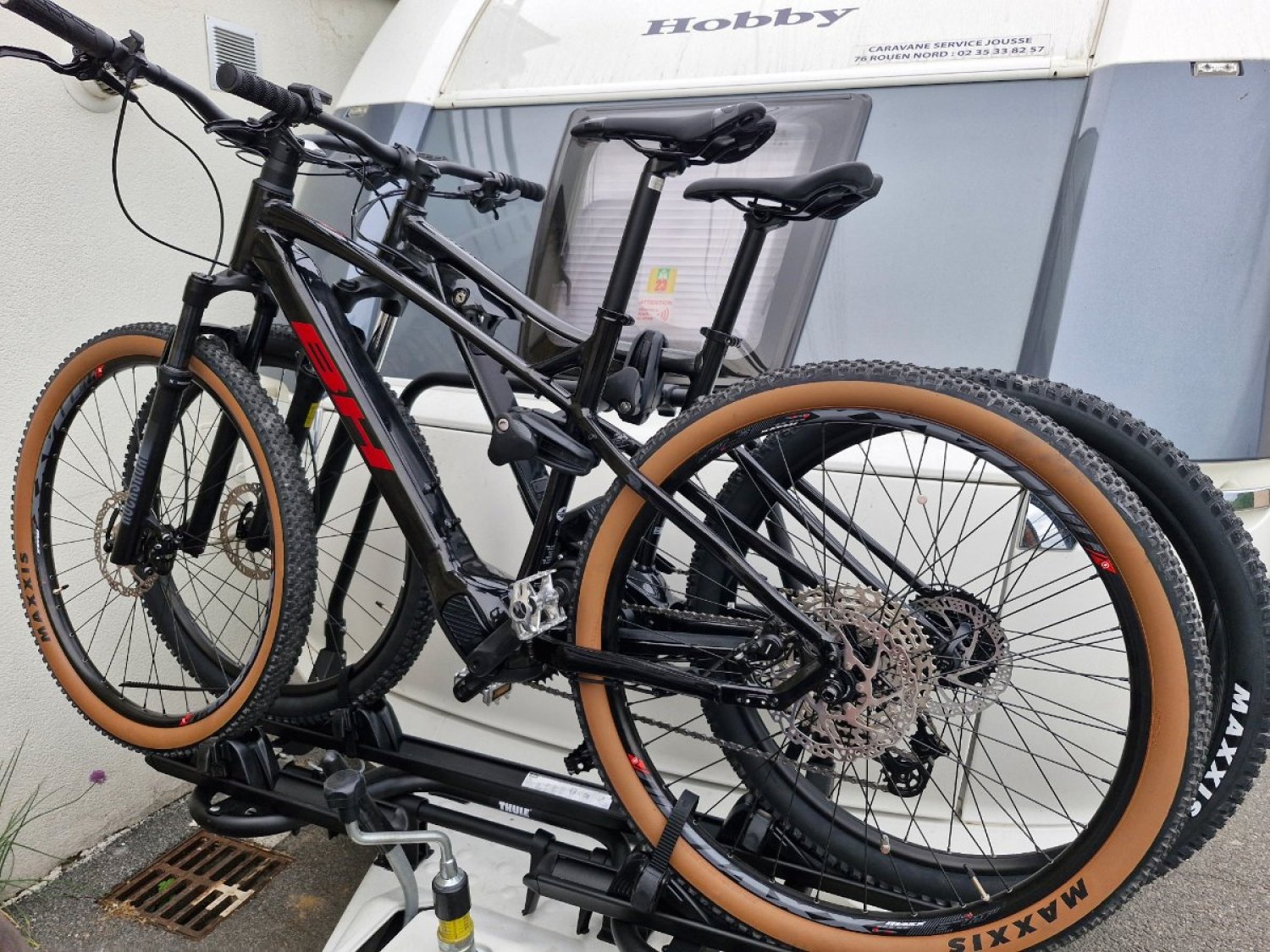 vends porte vélo spécial flêche caravane supportant deux vélos électriques acheté 365 euros chez OBELINCK état neuf à vendre 280 euros facture et descriptions à la suite .